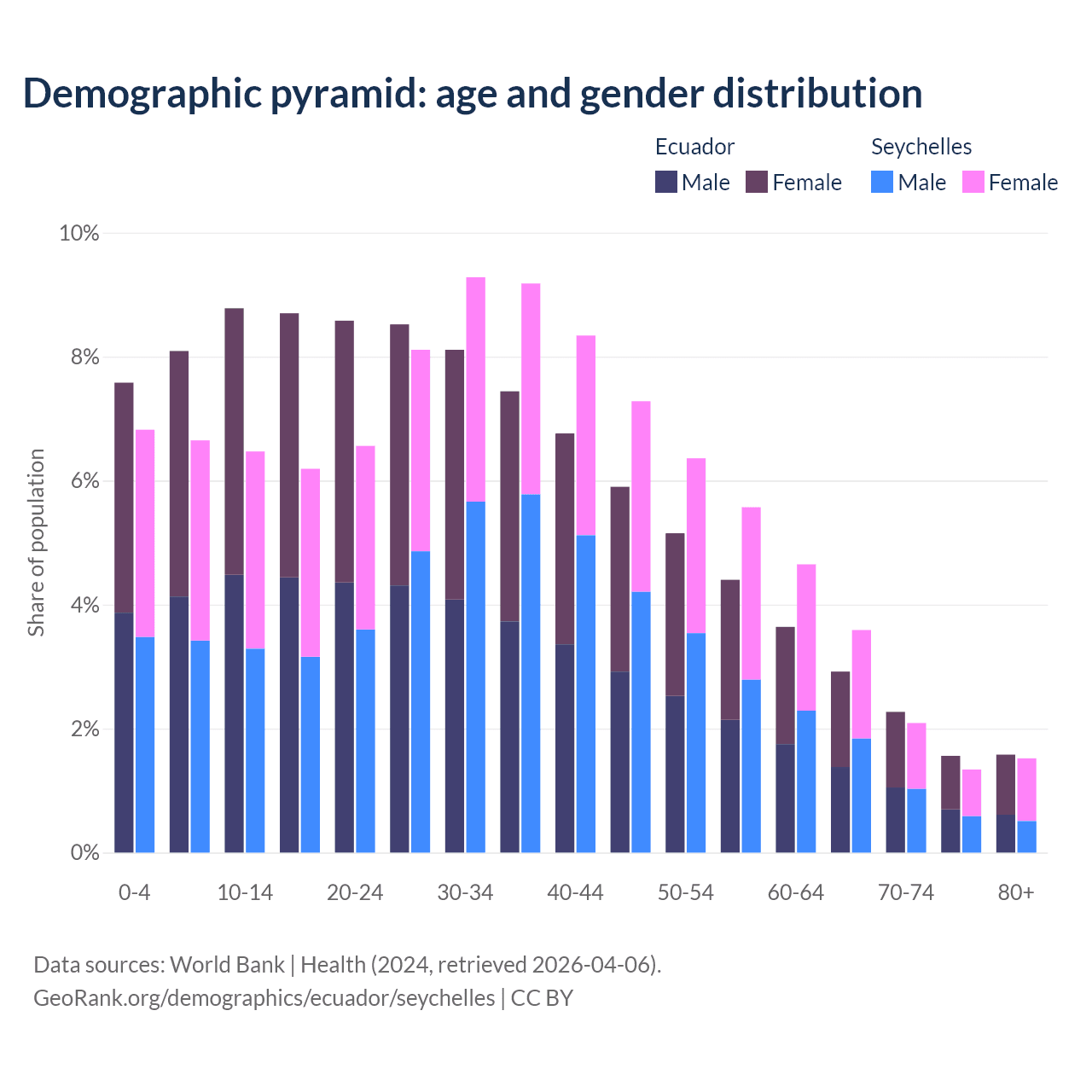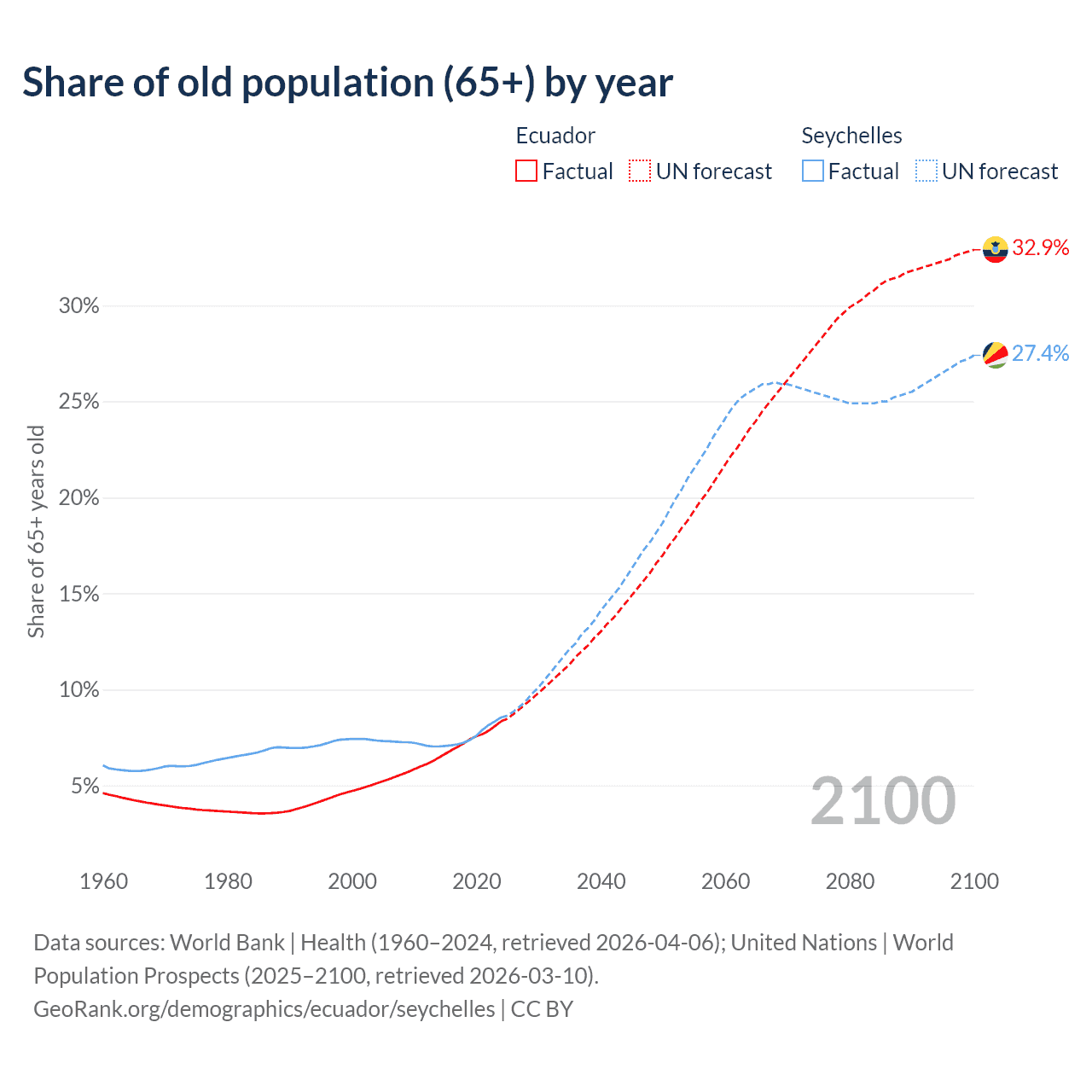 - The share of old-age demographic (65+) in Ecuador is 8.34% vs 8.54% in the Seychelles.