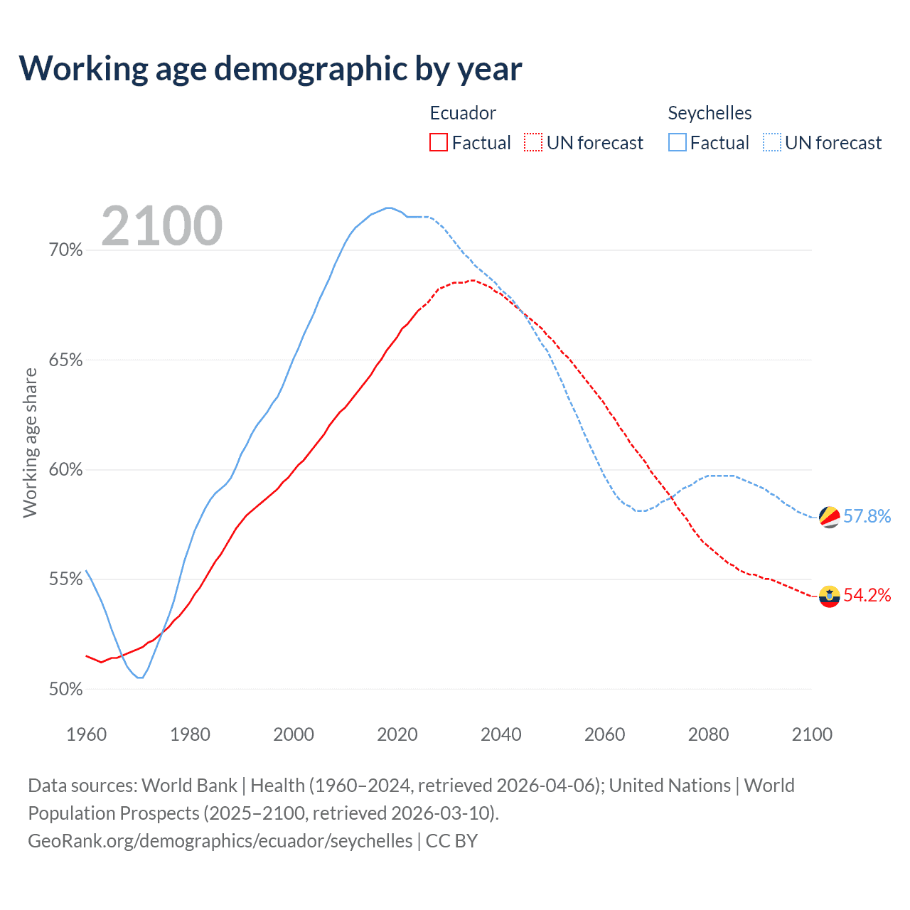 Median age Ecuador vs Seychelles, 1960-2100