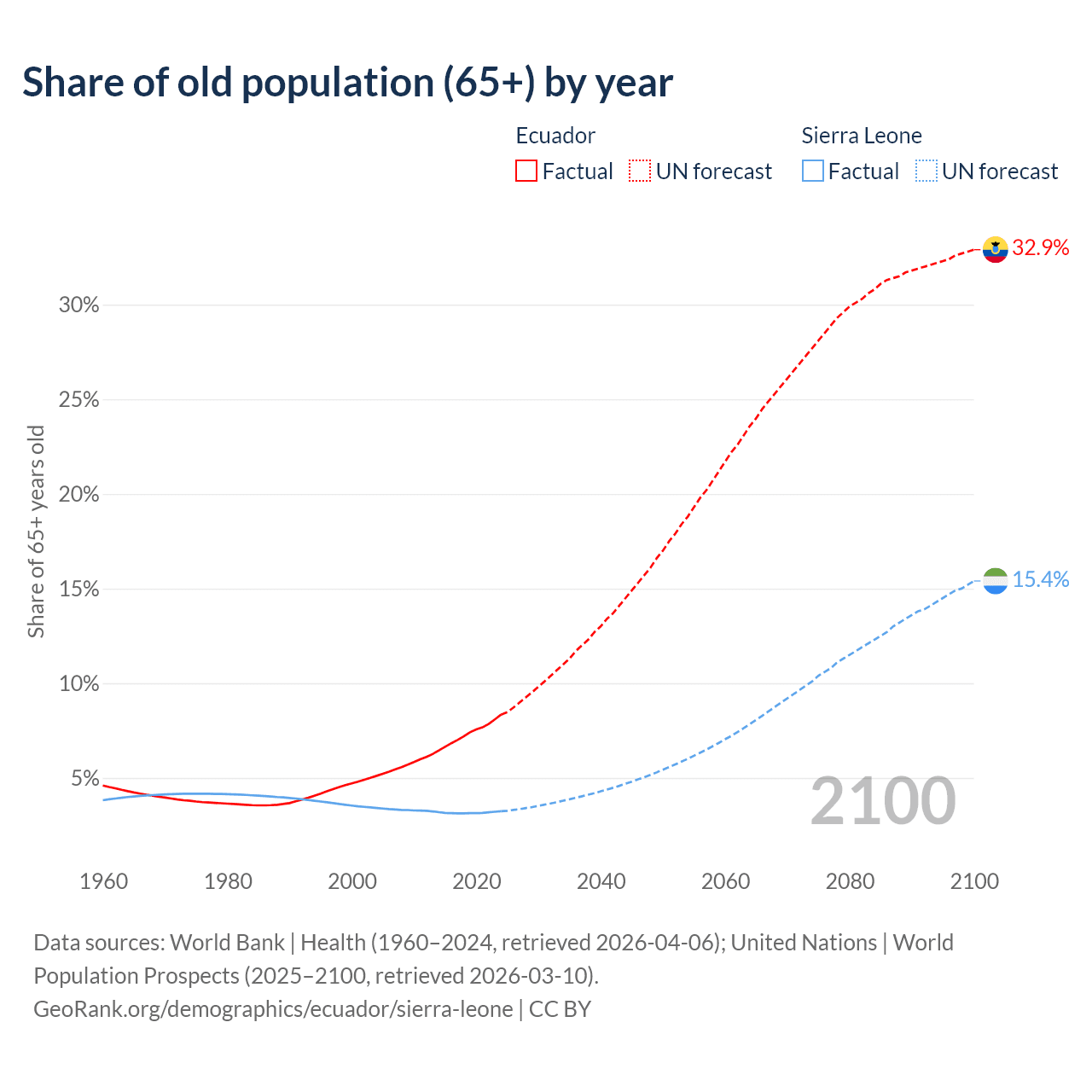 The share of older people aged 65 and over is 8.34% in Ecuador and 3.24% in Sierra Leone. Life expectancy in Ecuador compared to Sierra Leone .