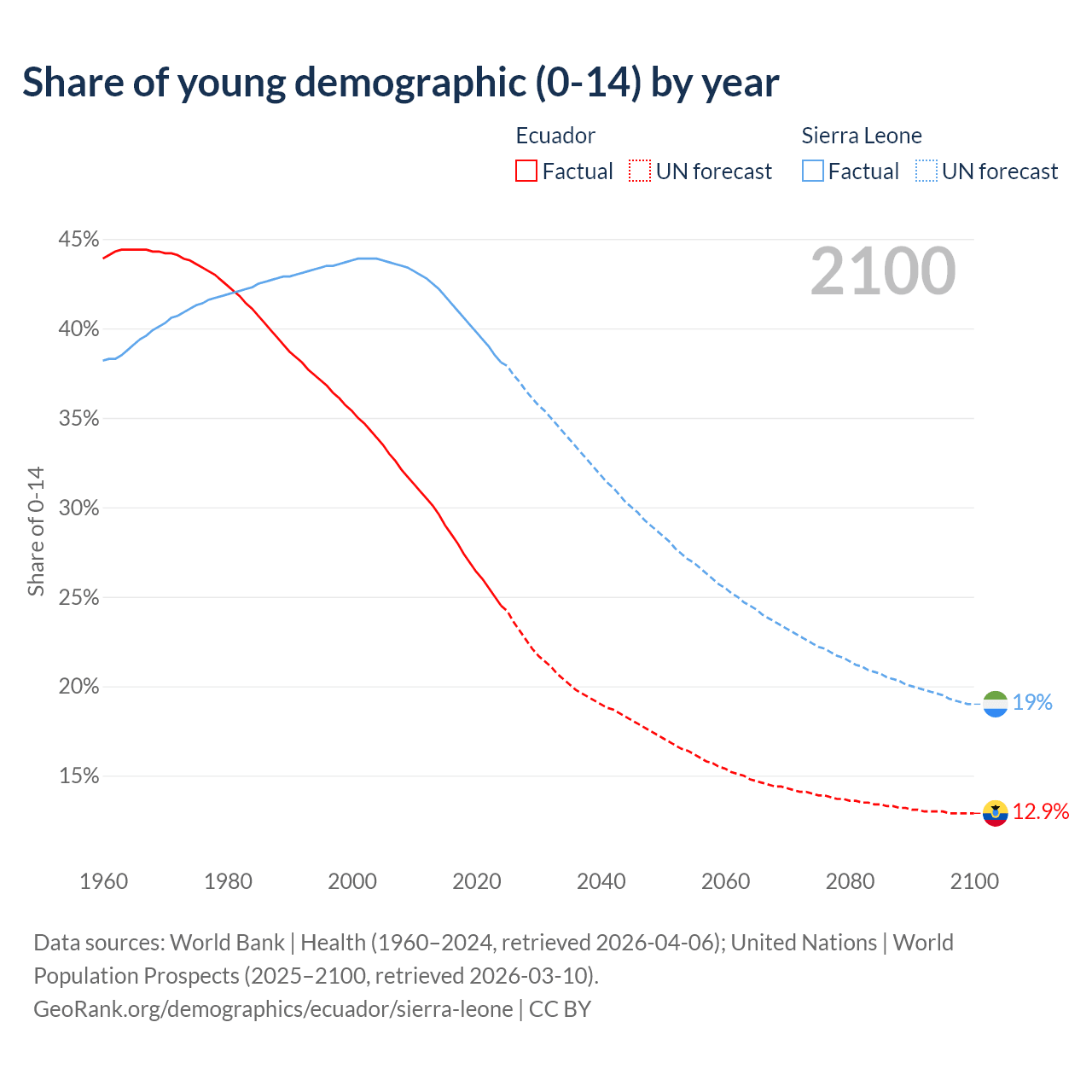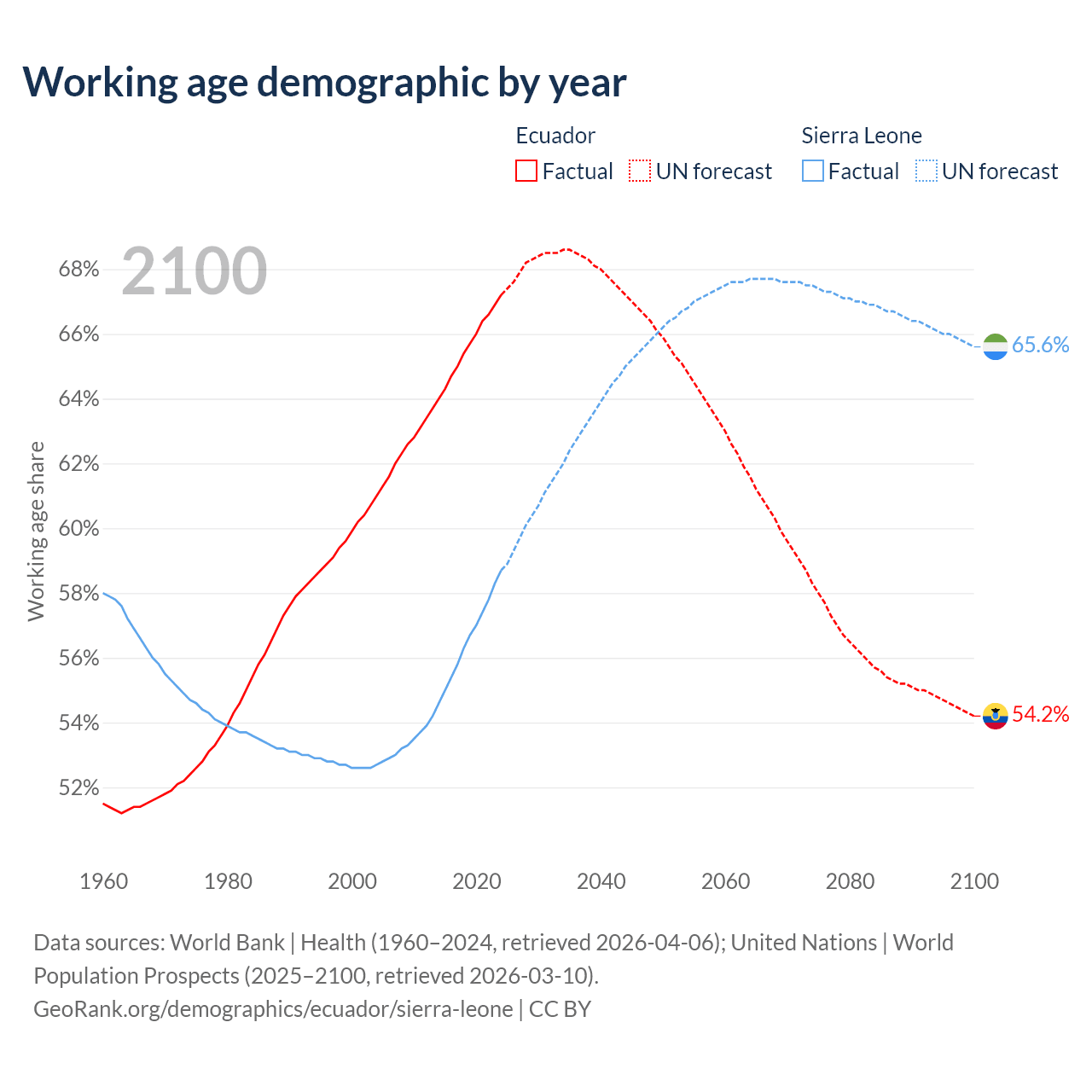 Median age Ecuador vs Sierra Leone, 1960-2100