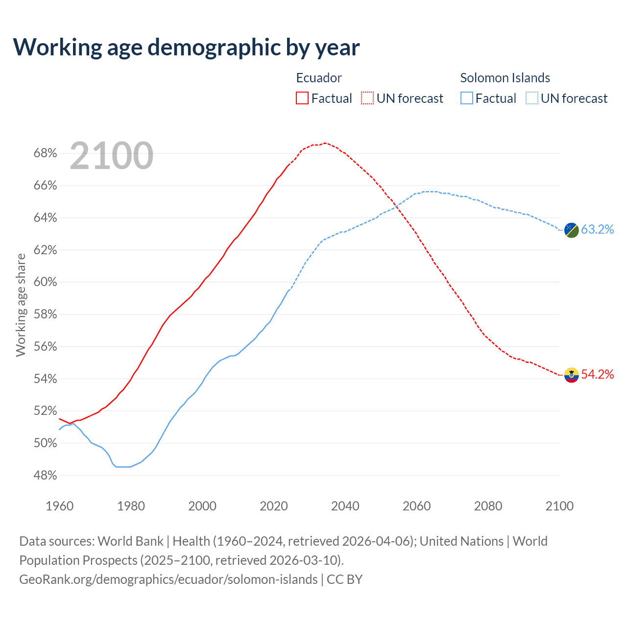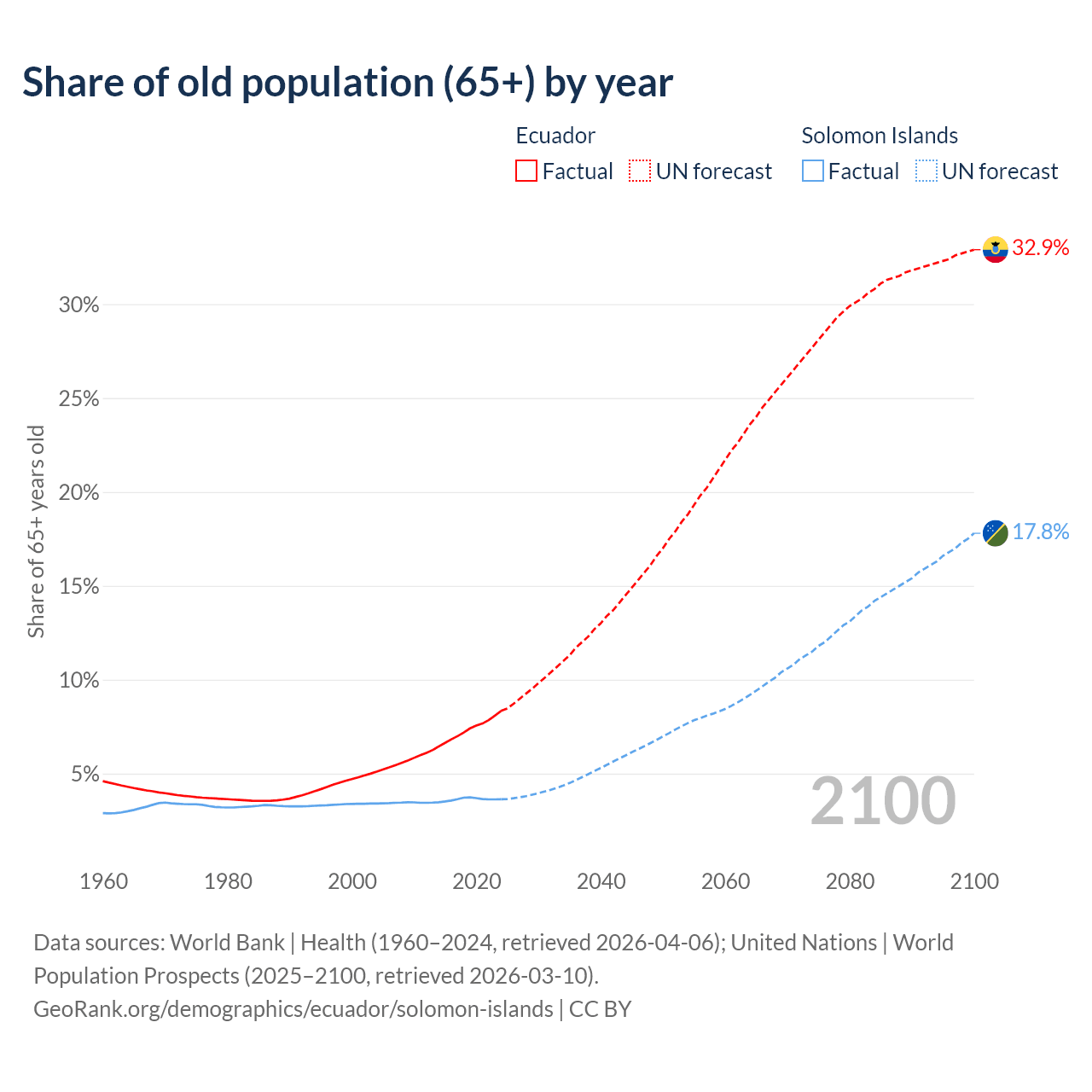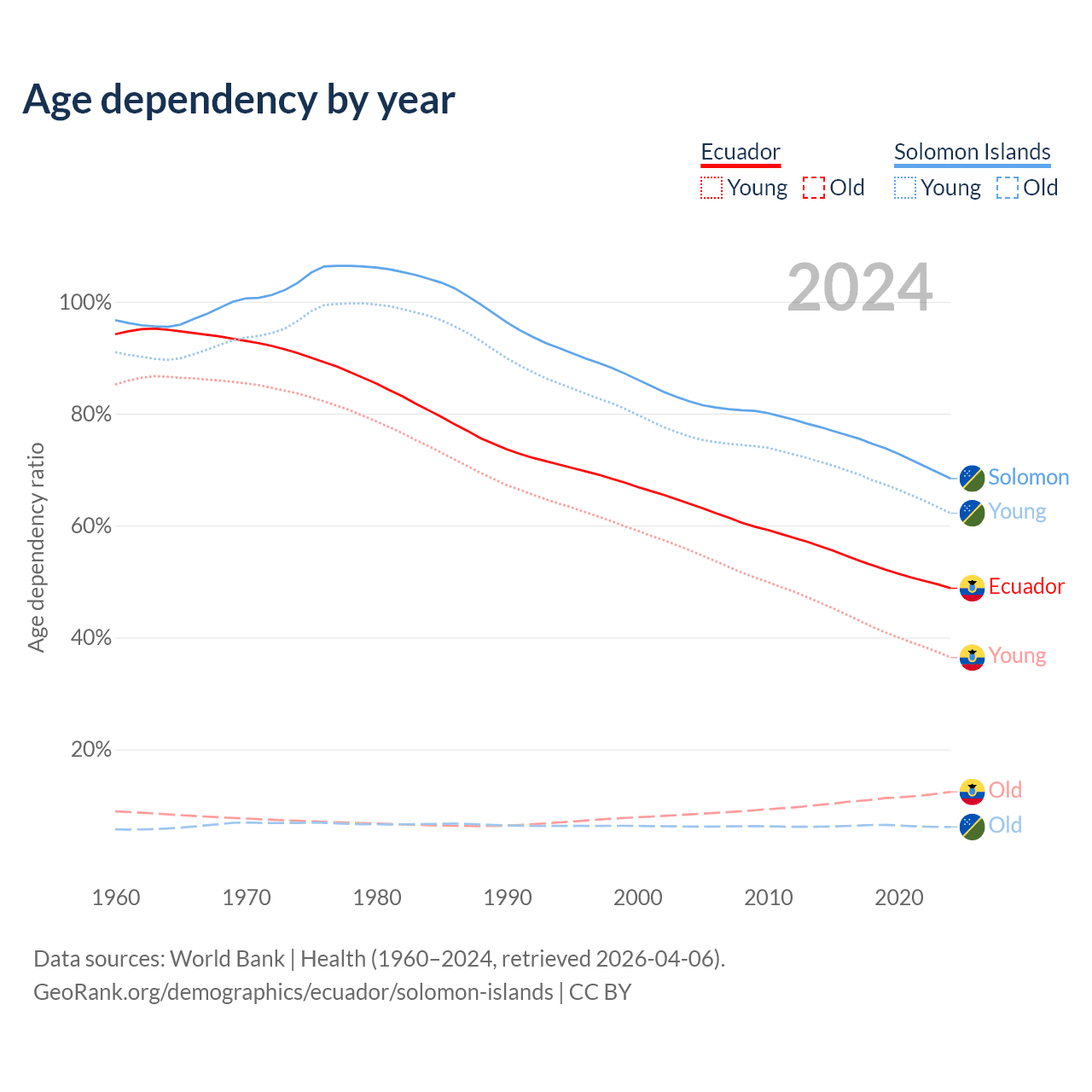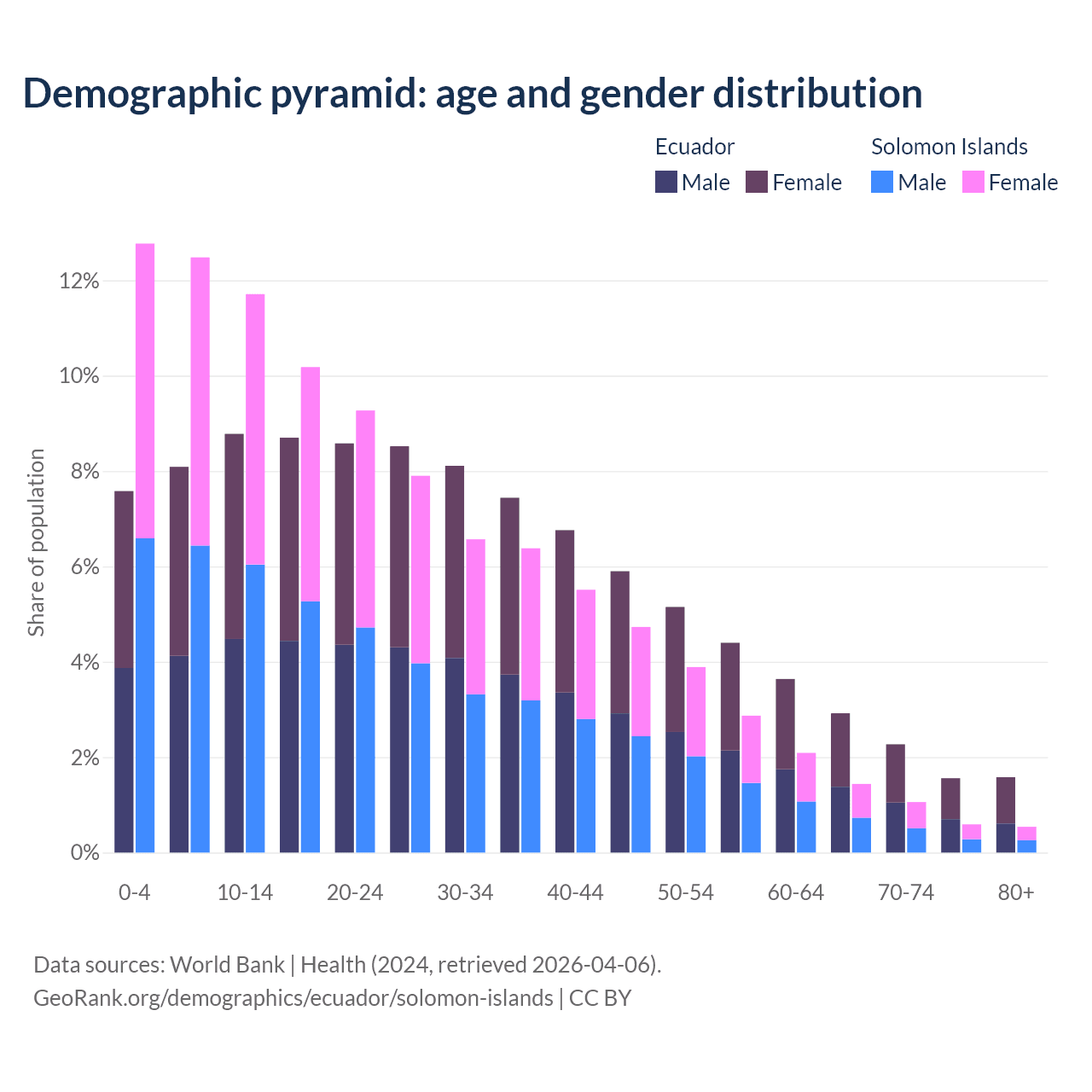 - The share of old-age demographic (65+) in Ecuador is 8.34% vs 3.64% in the Solomon Islands.
