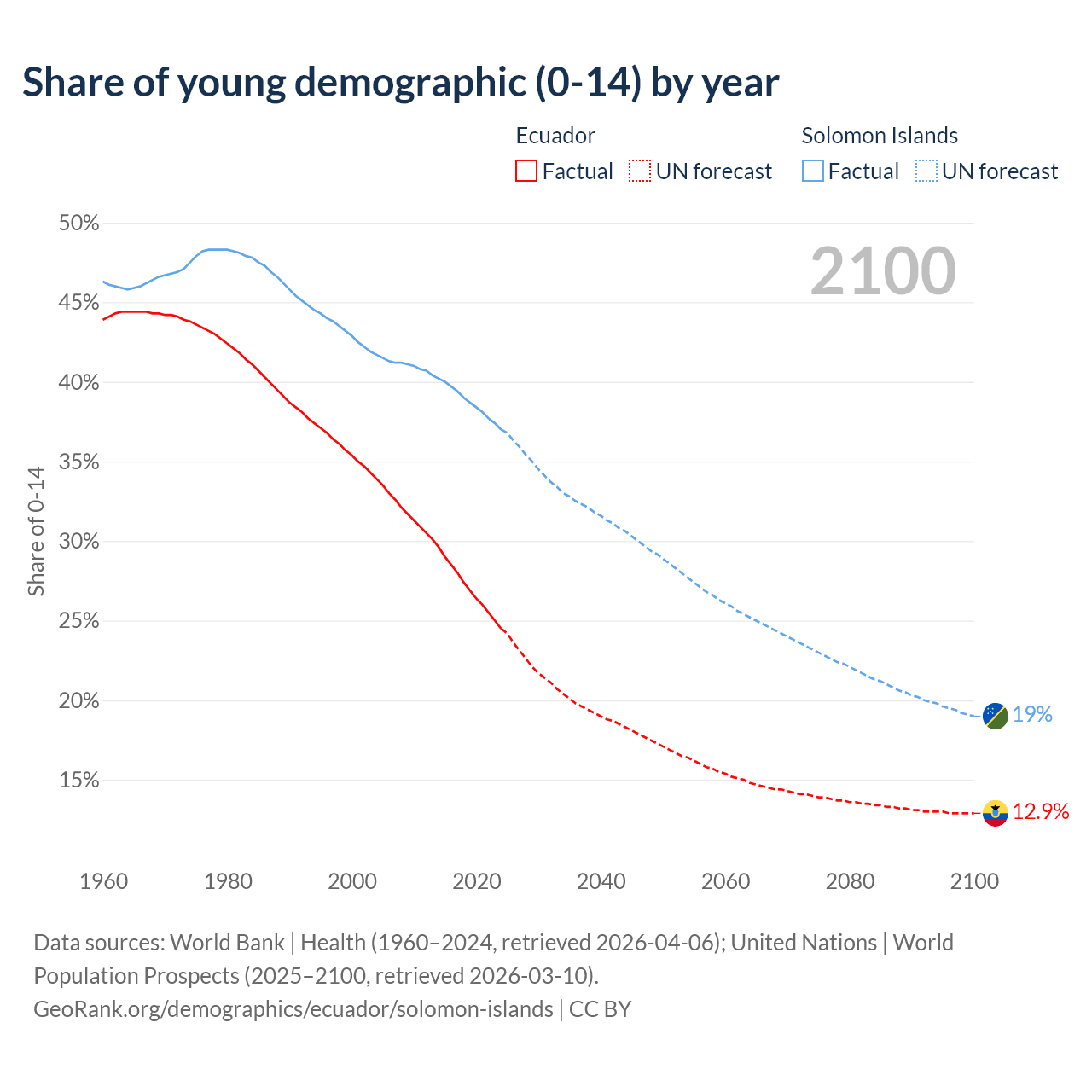 - The share of young demographic (0-15 years old) in Ecuador is 24.5% vs 37% in the Solomon Islands.