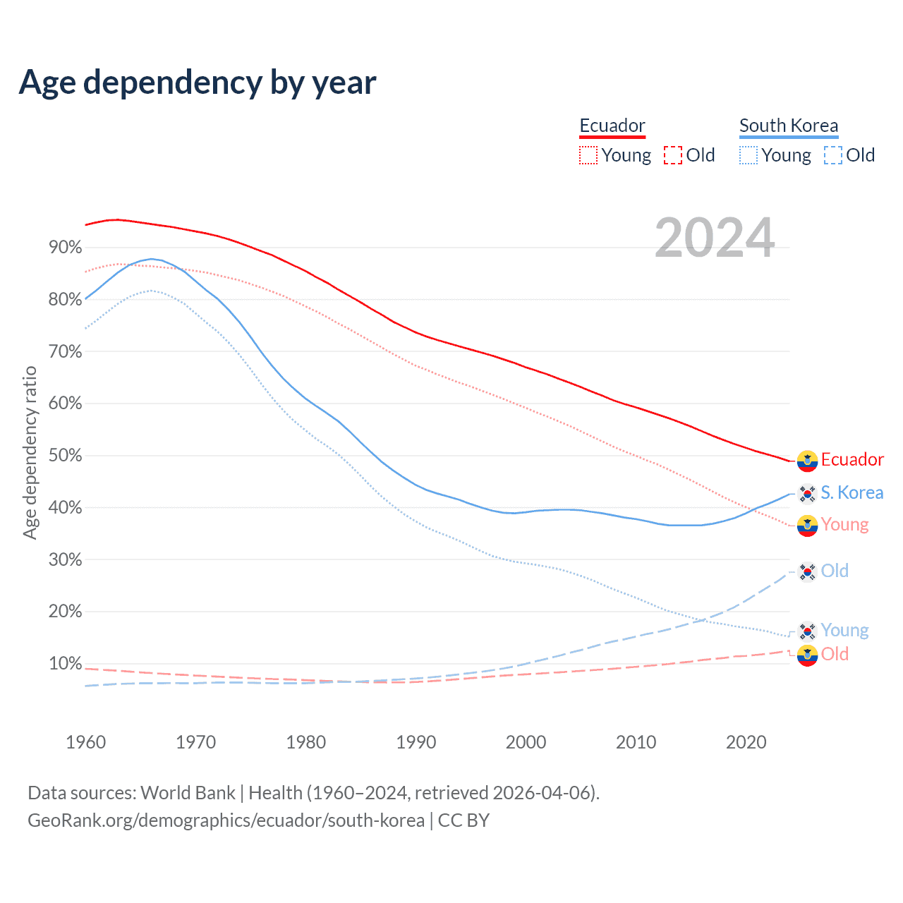 - Ecuador is ranked 105/196 by median age (oldest to youngest) vs 10/196 for South Korea.
