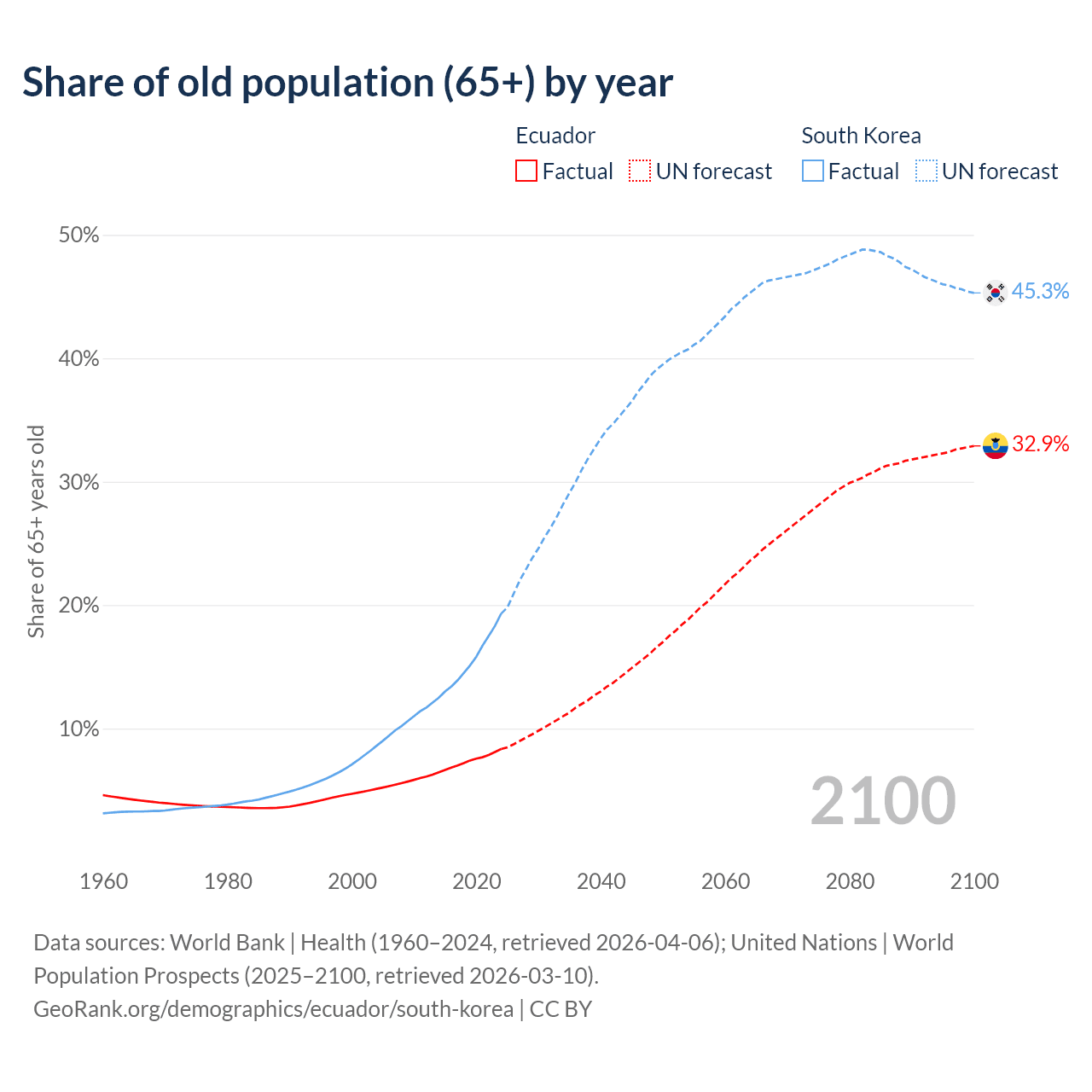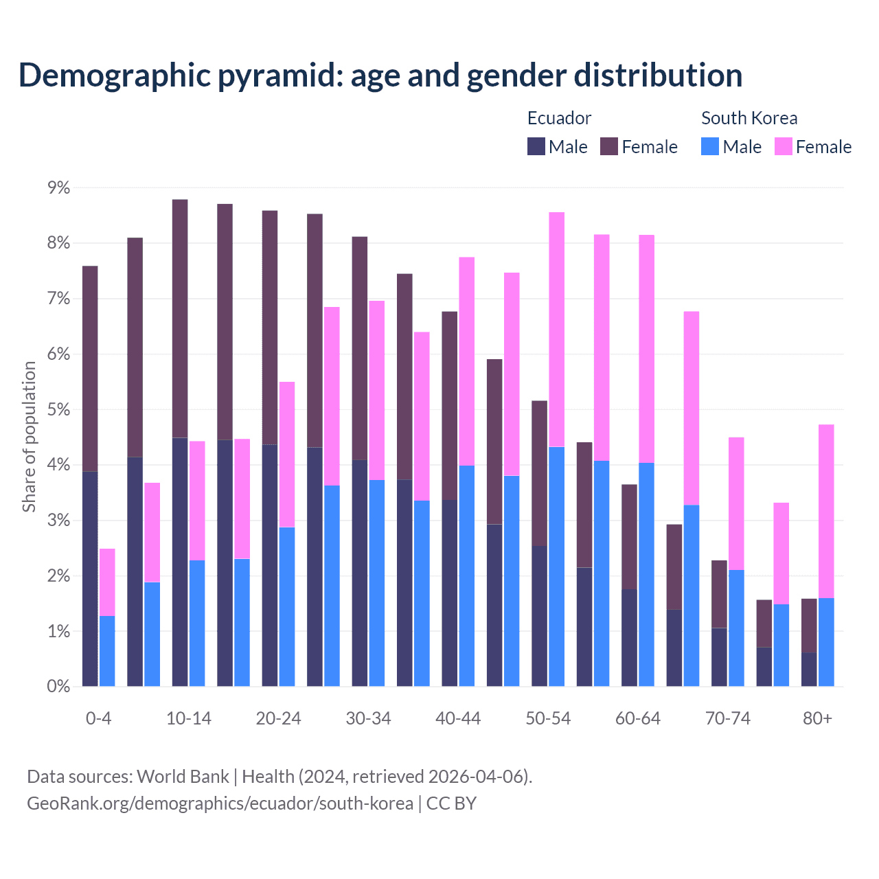The share of older people aged 65 and over is 8.34% in Ecuador and 19.3% in South Korea. Life expectancy in Ecuador compared to South Korea .