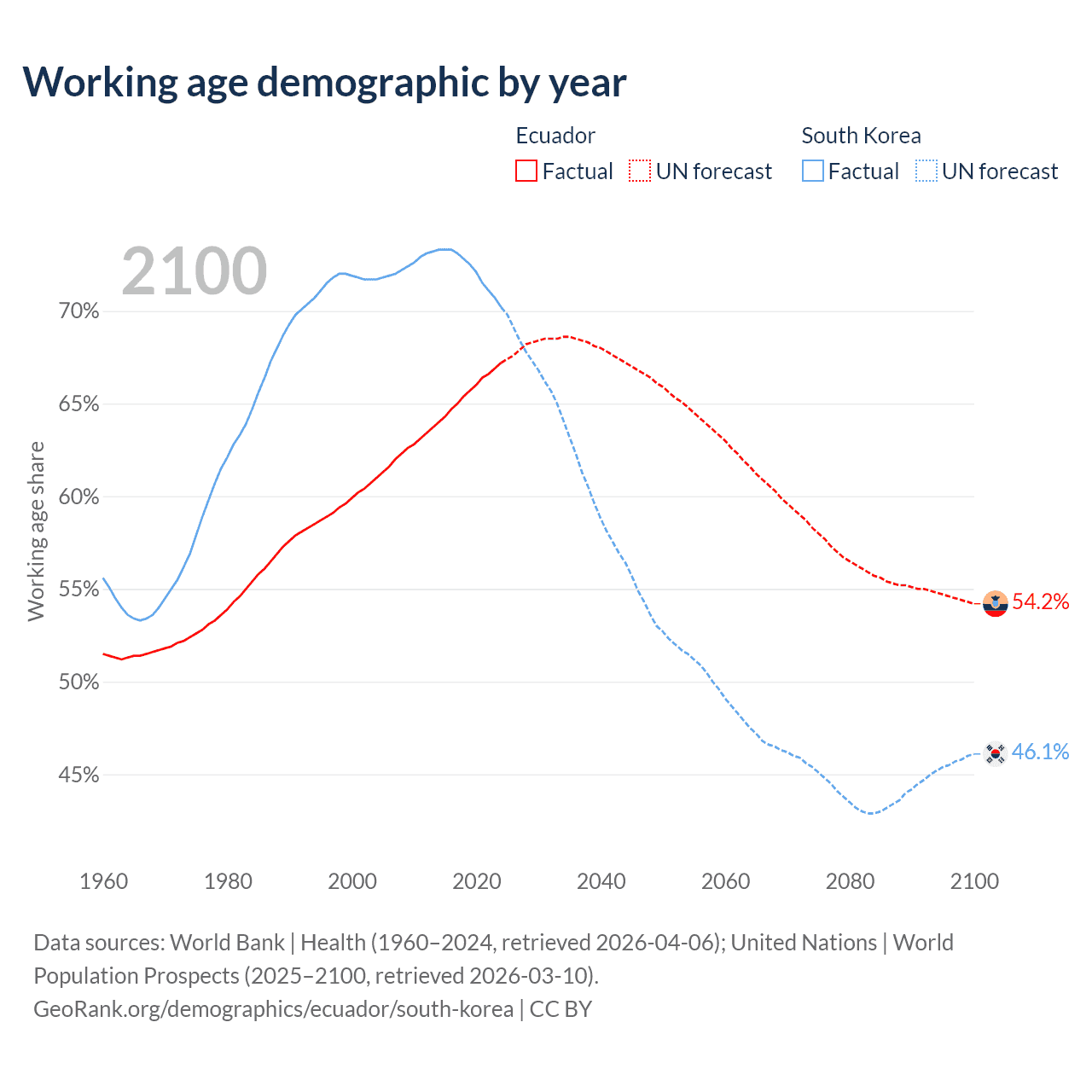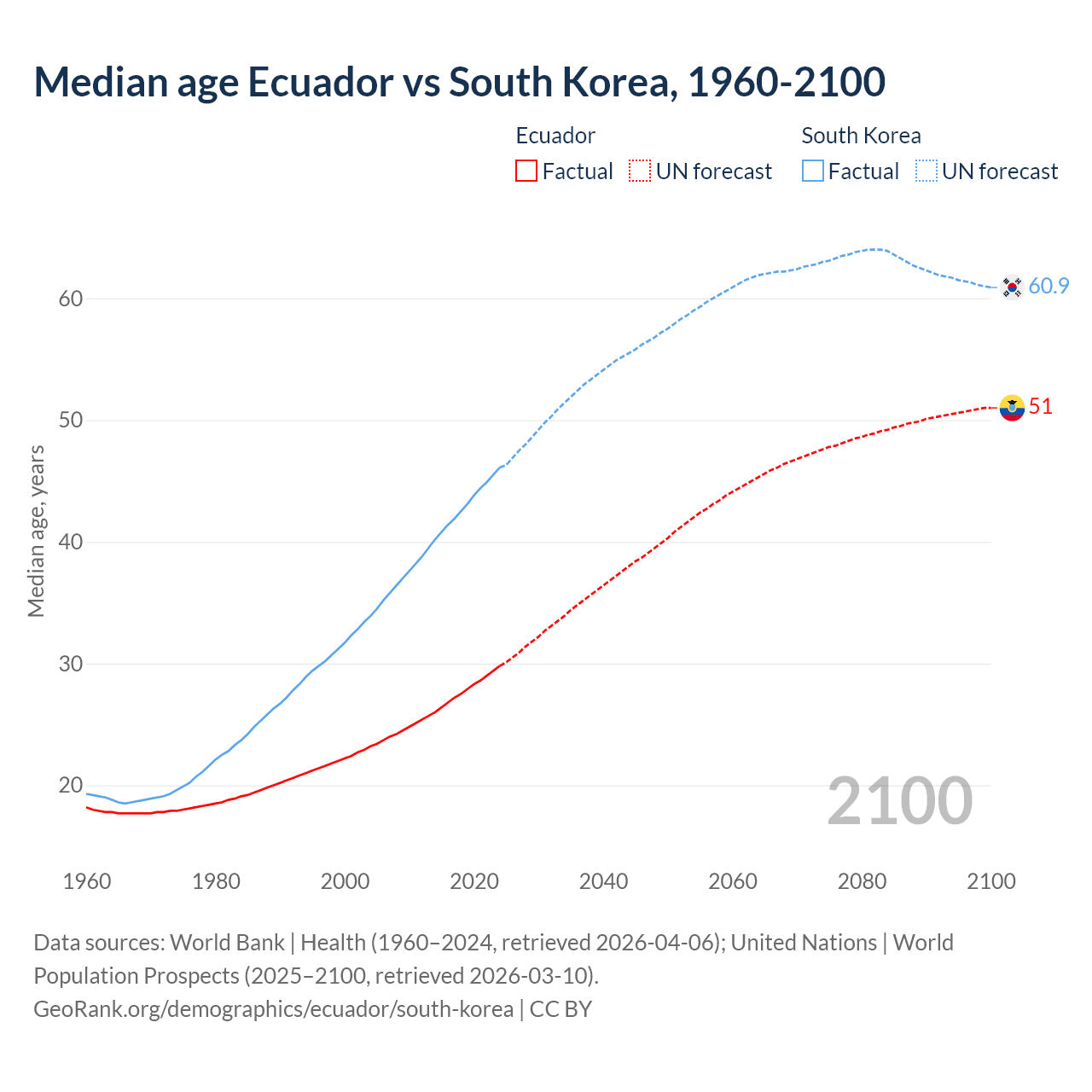 Median age Ecuador vs South Korea, 1960-2100