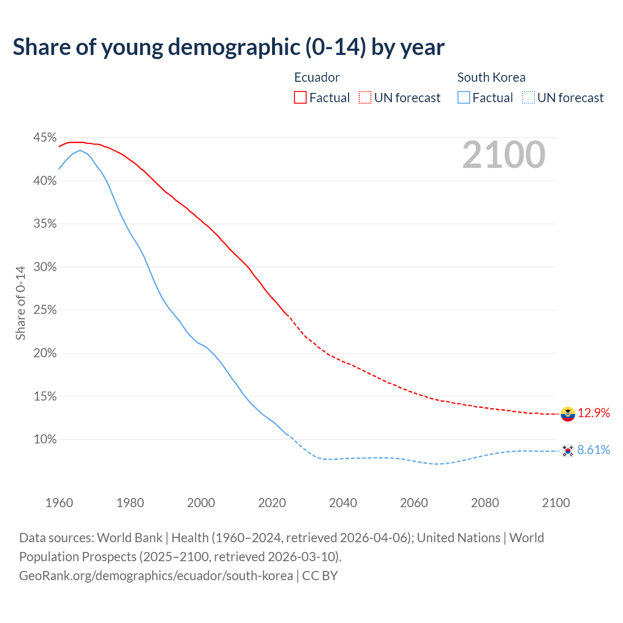 - The share of young demographic (0-15 years old) in Ecuador is 24.5% vs 10.6% in South Korea.