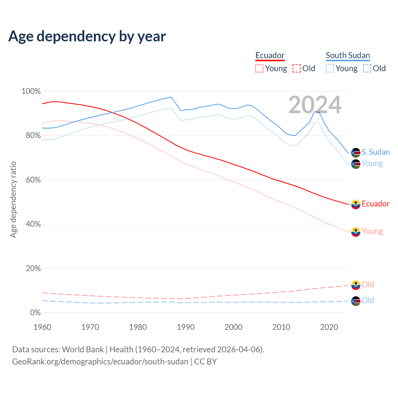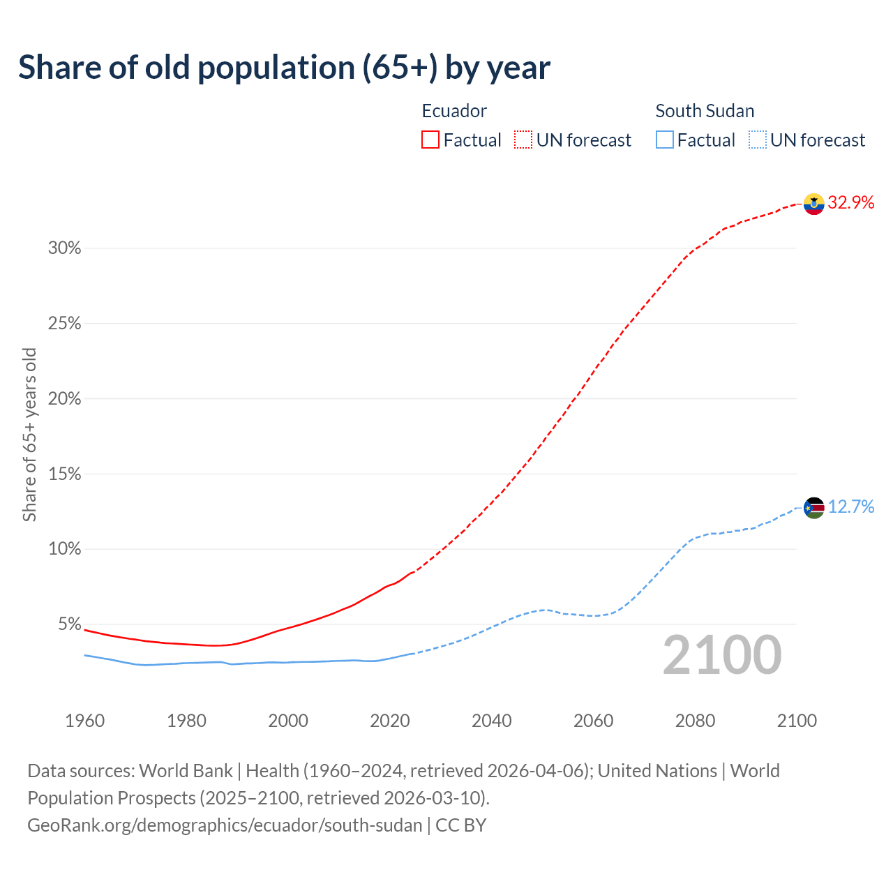 - The share of old-age demographic (65+) in Ecuador is 8.34% vs 2.99% in South Sudan.
