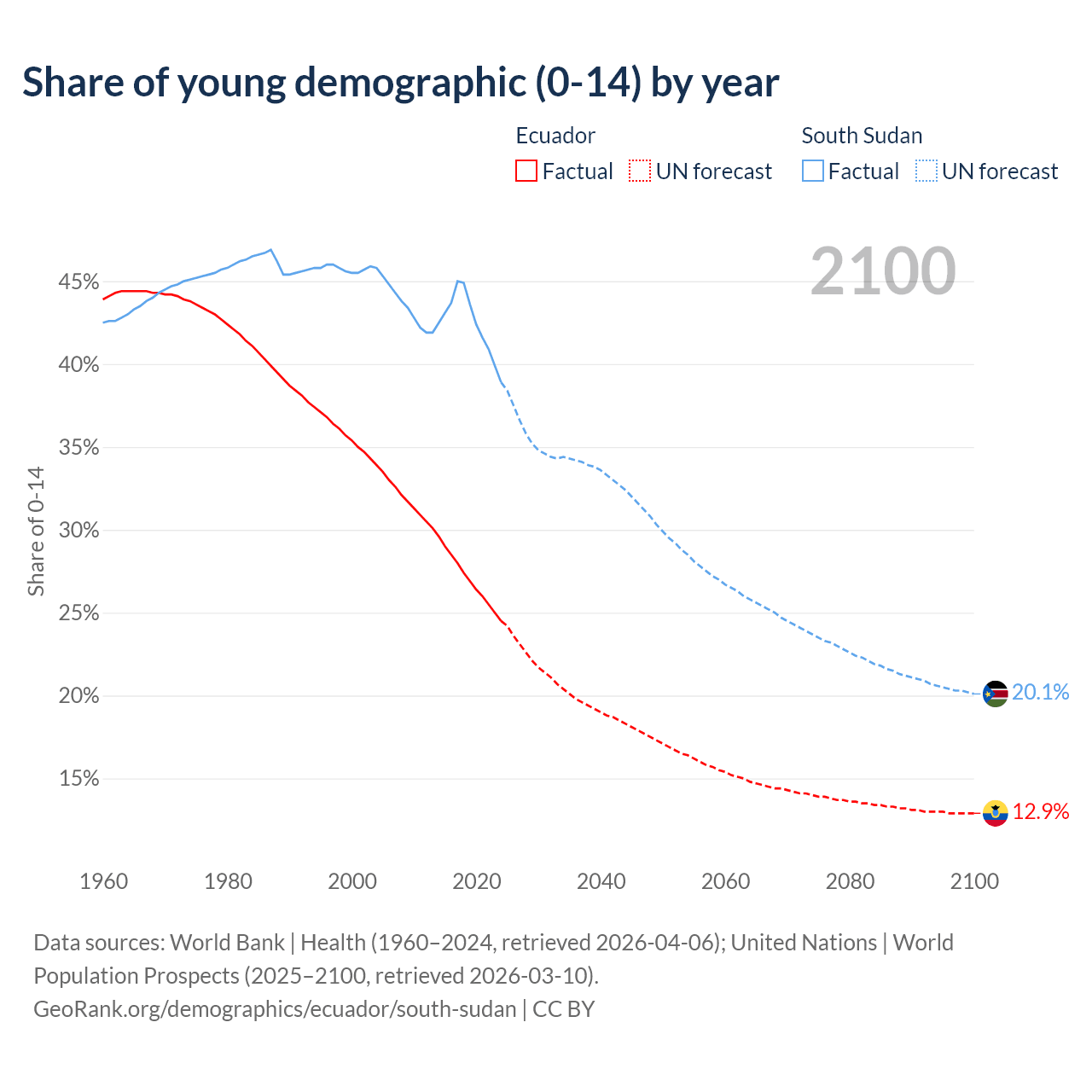 - The share of young demographic (0-15 years old) in Ecuador is 24.5% vs 38.9% in South Sudan.
