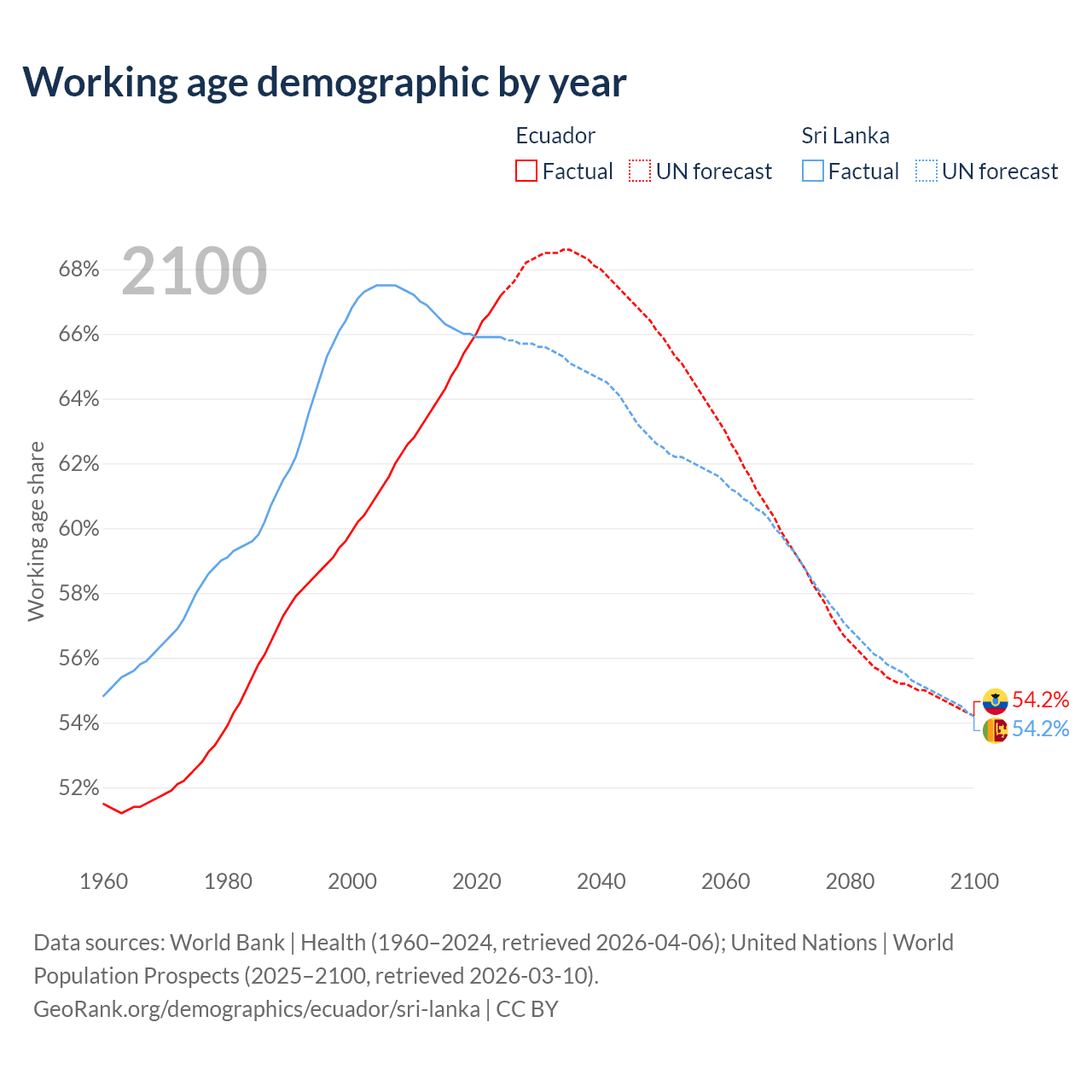 Median age Ecuador vs Sri Lanka, 1960-2100