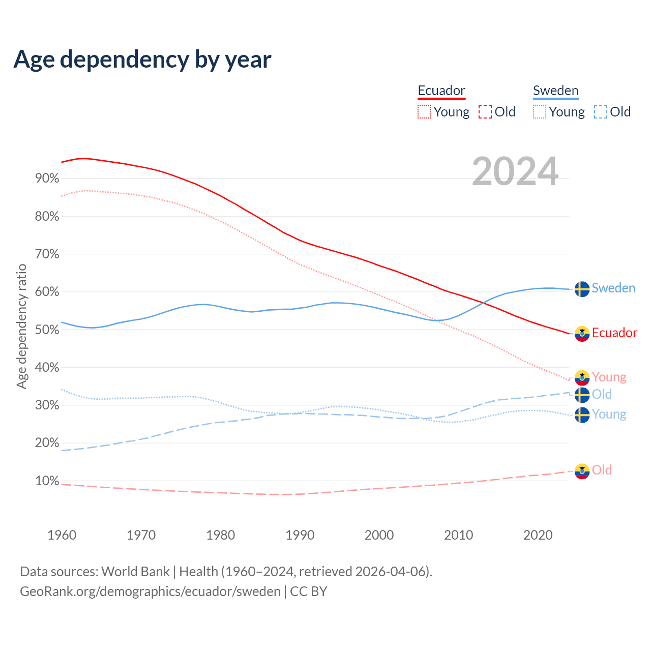 - Ecuador is ranked 105/196 by median age (oldest to youngest) vs 39/196 for Sweden.