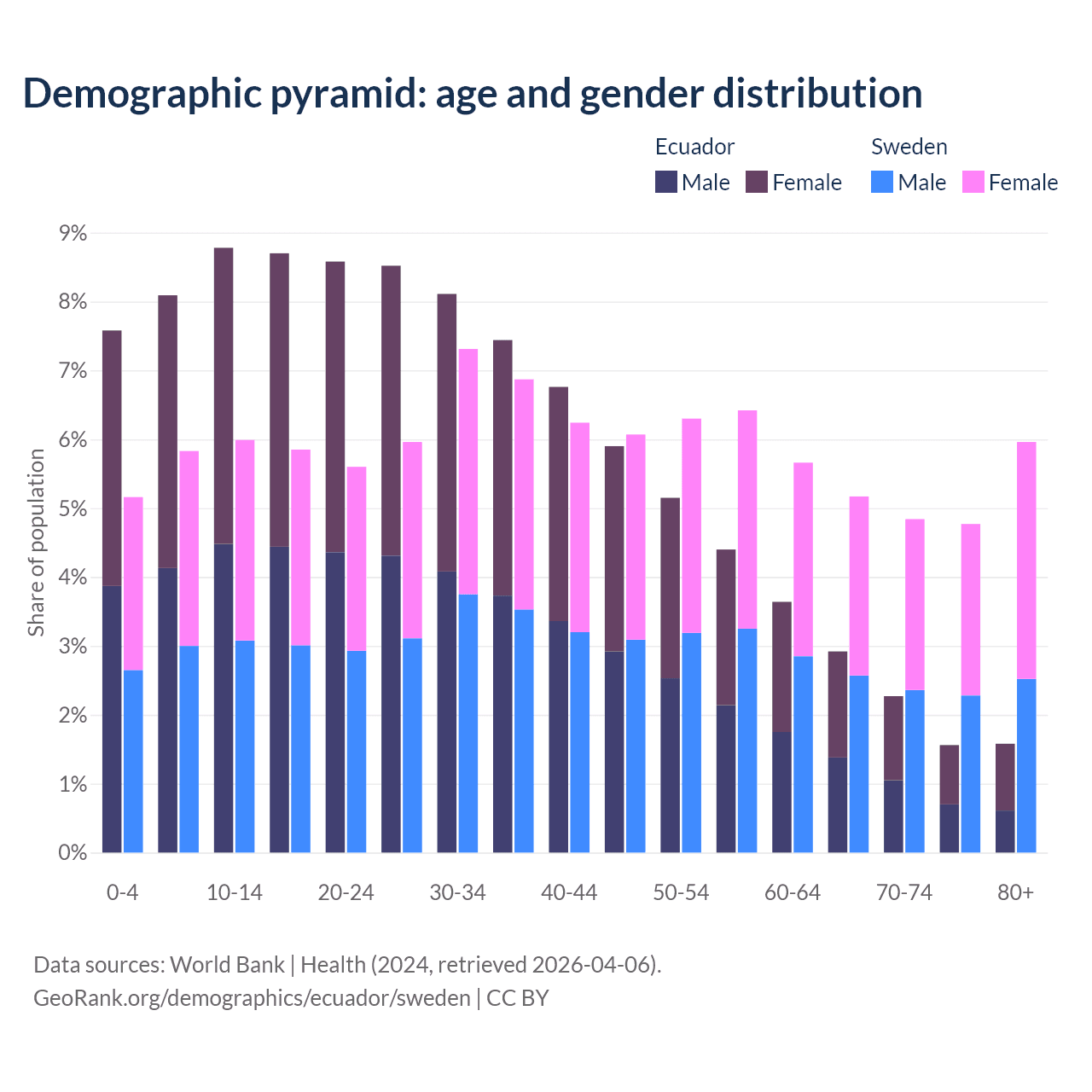 - The share of old-age demographic (65+) in Ecuador is 8.34% vs 20.7% in Sweden.