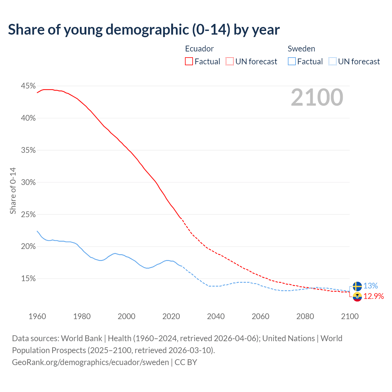 - The share of young demographic (0-15 years old) in Ecuador is 24.5% vs 17% in Sweden.