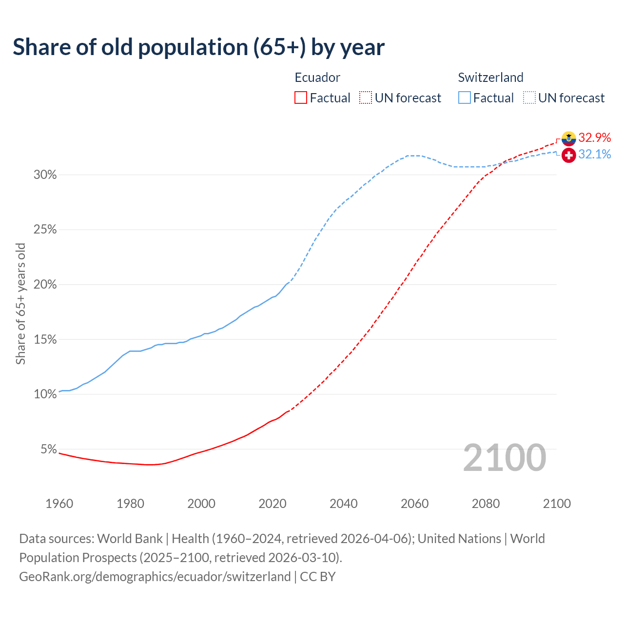 The share of older people aged 65 and over is 8.34% in Ecuador and 20% in Switzerland. Life expectancy in Ecuador compared to Switzerland .