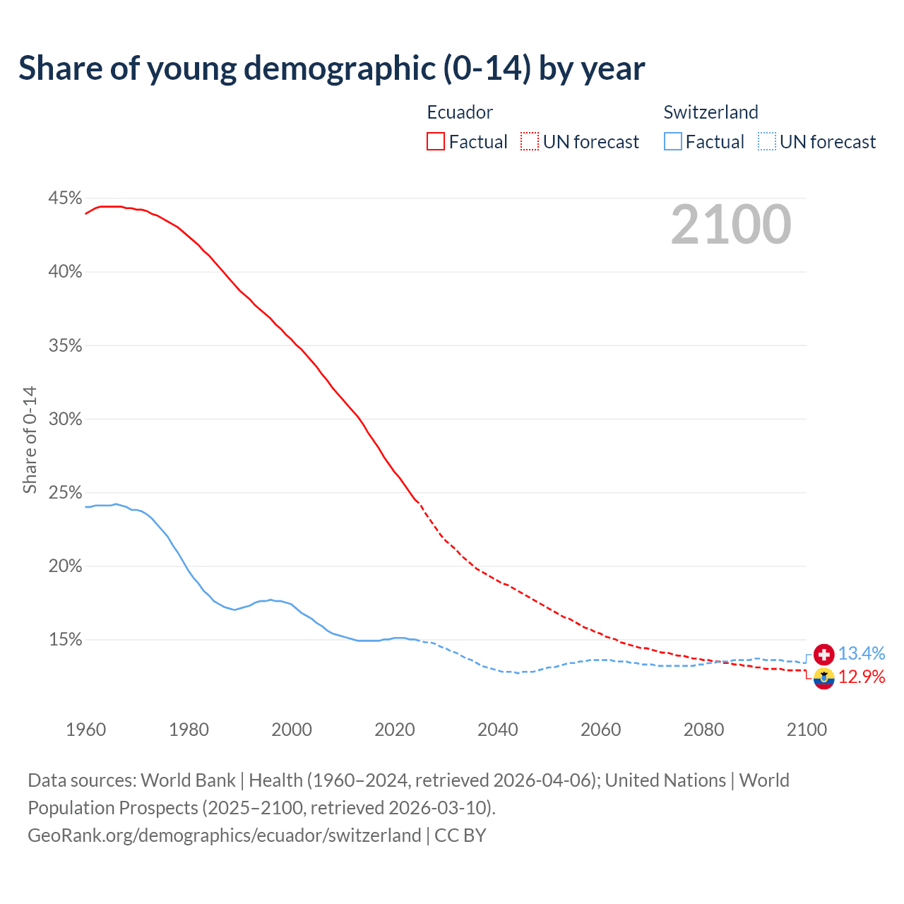 - The share of young demographic (0-15 years old) in Ecuador is 24.5% vs 15% in Switzerland.