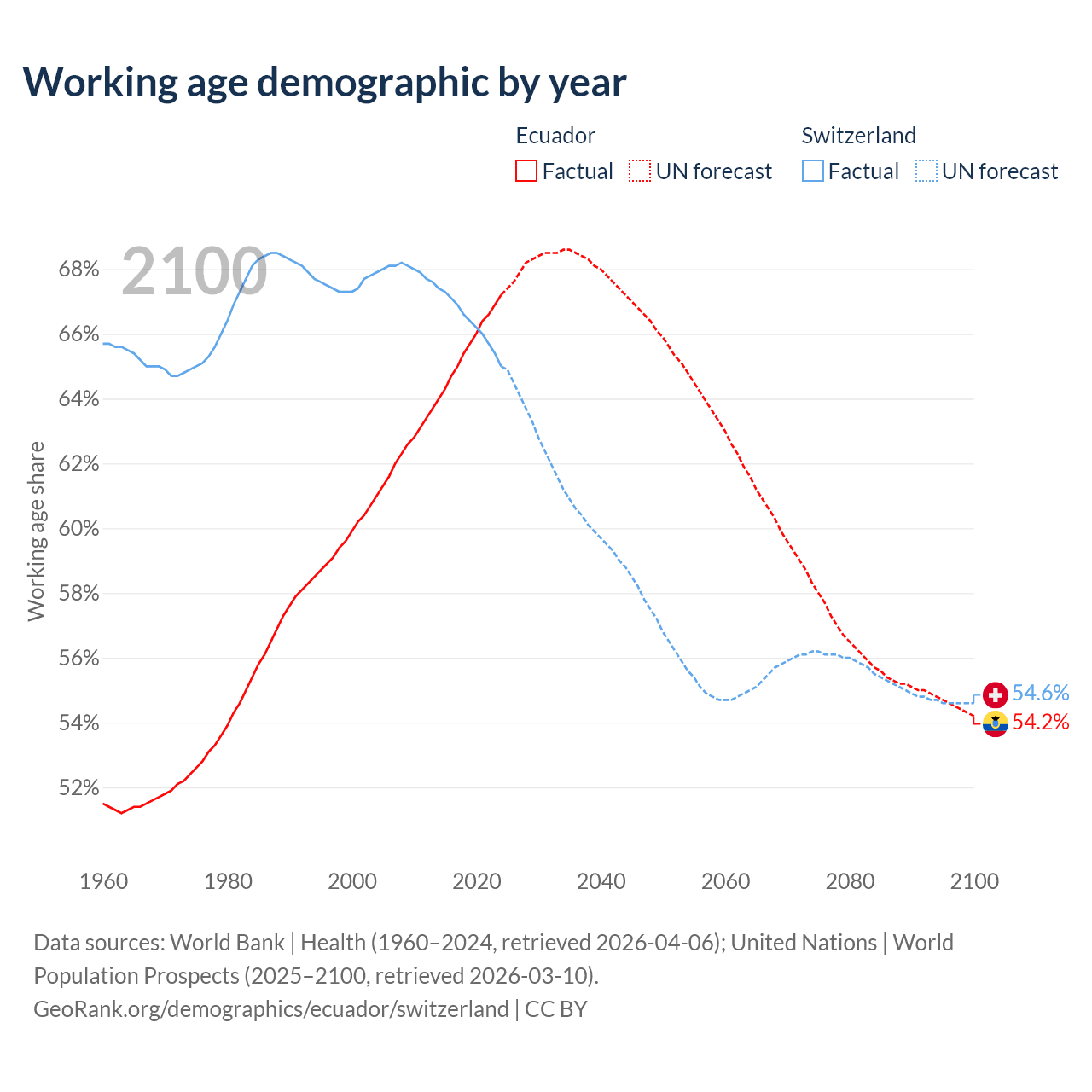 Median age Ecuador vs Switzerland, 1960-2100
