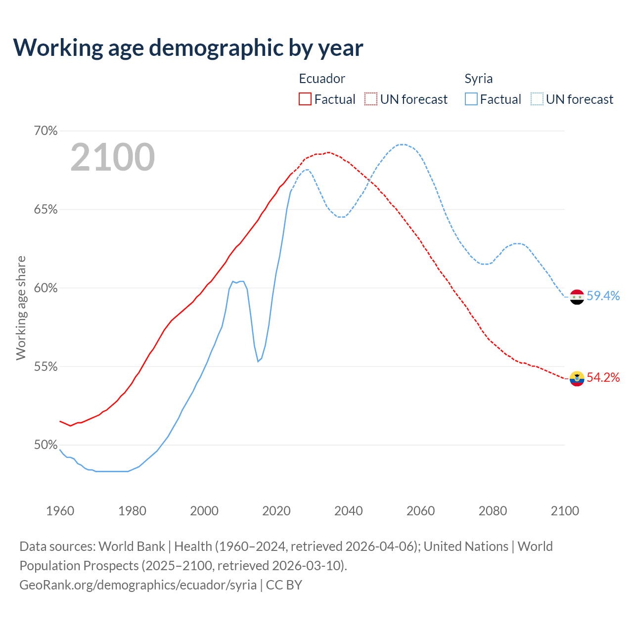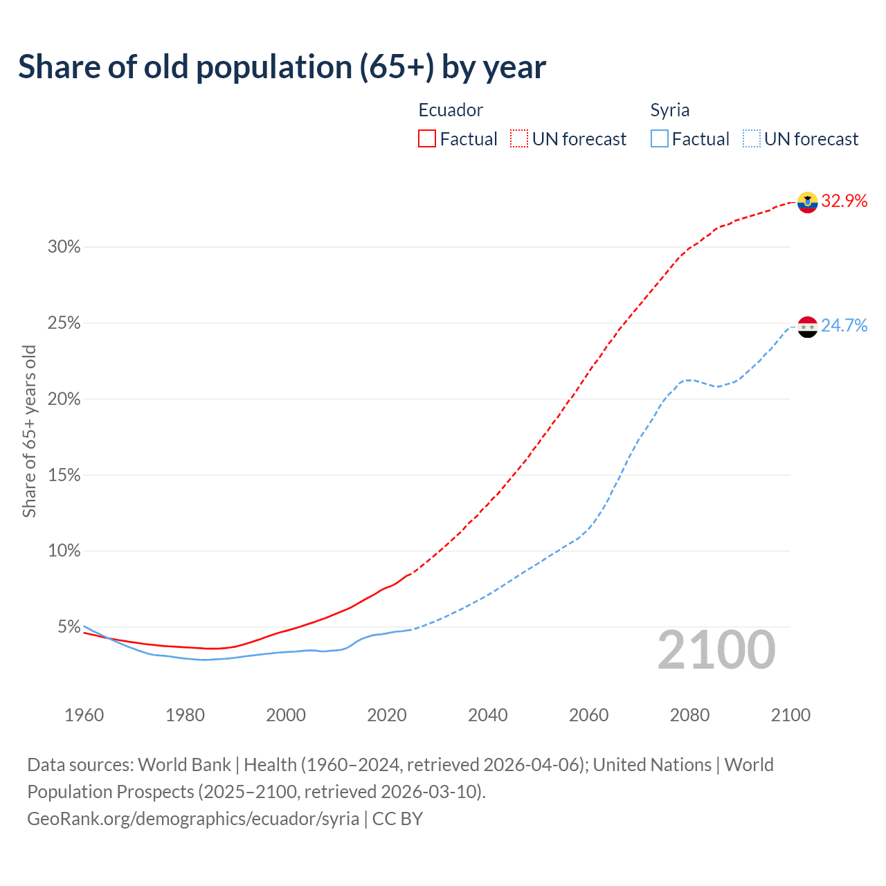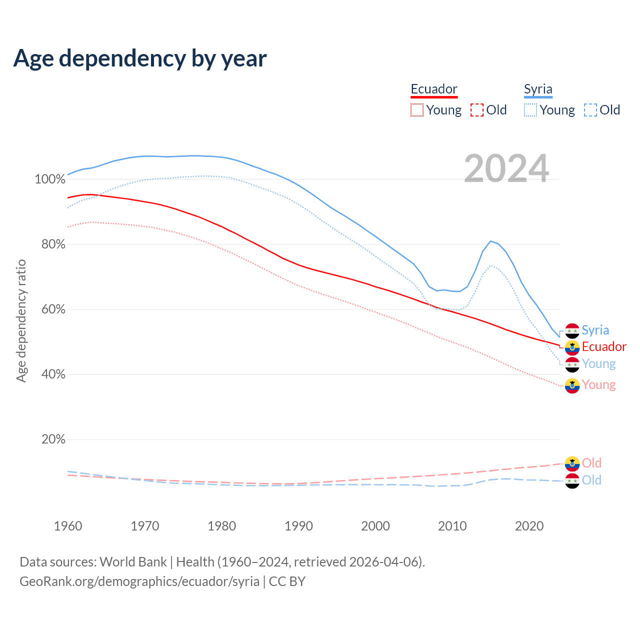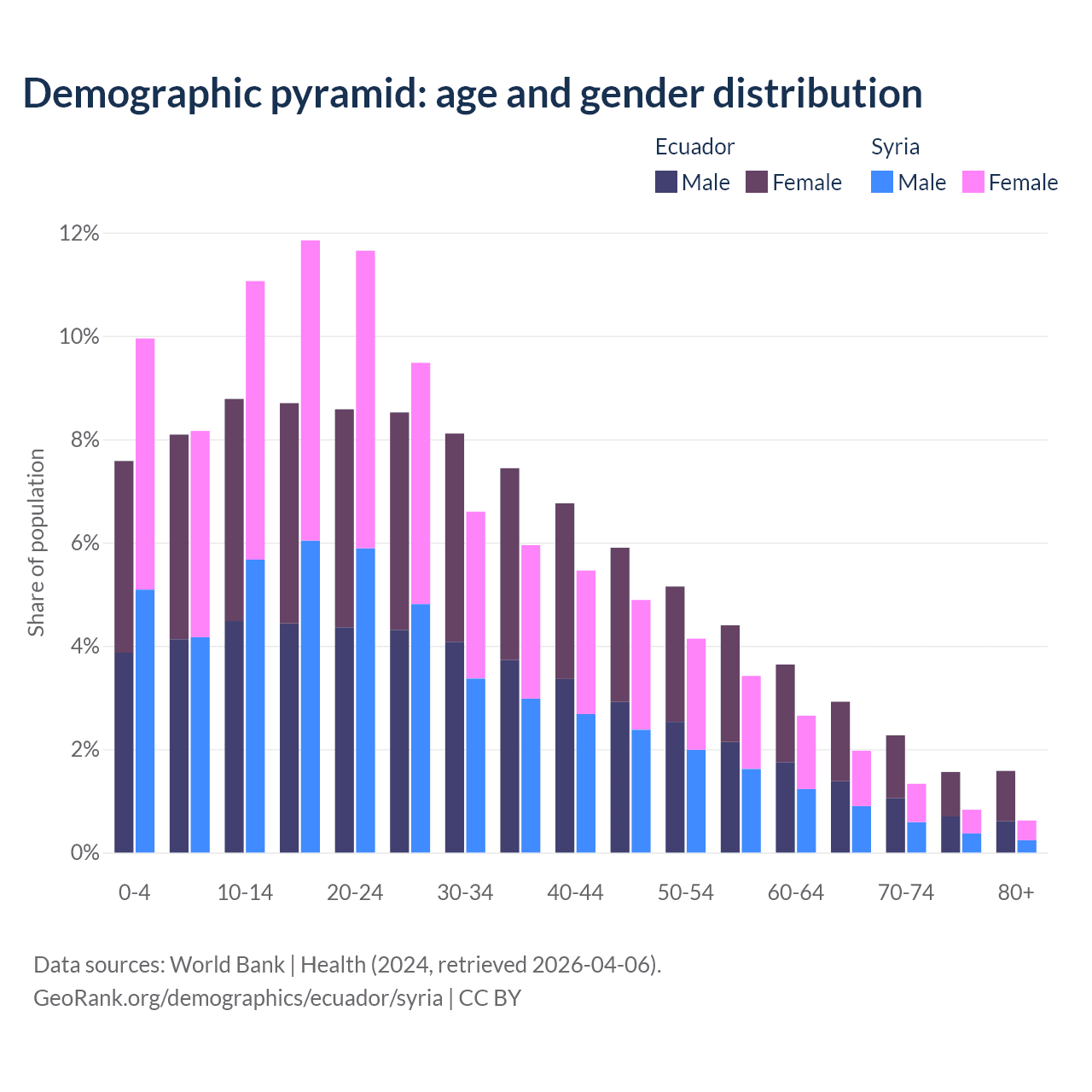 - The share of old-age demographic (65+) in Ecuador is 8.34% vs 4.74% in Syria.