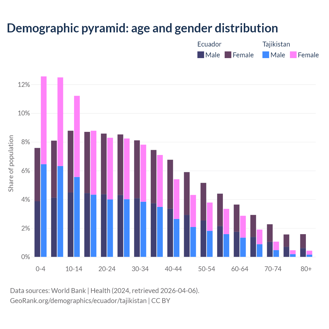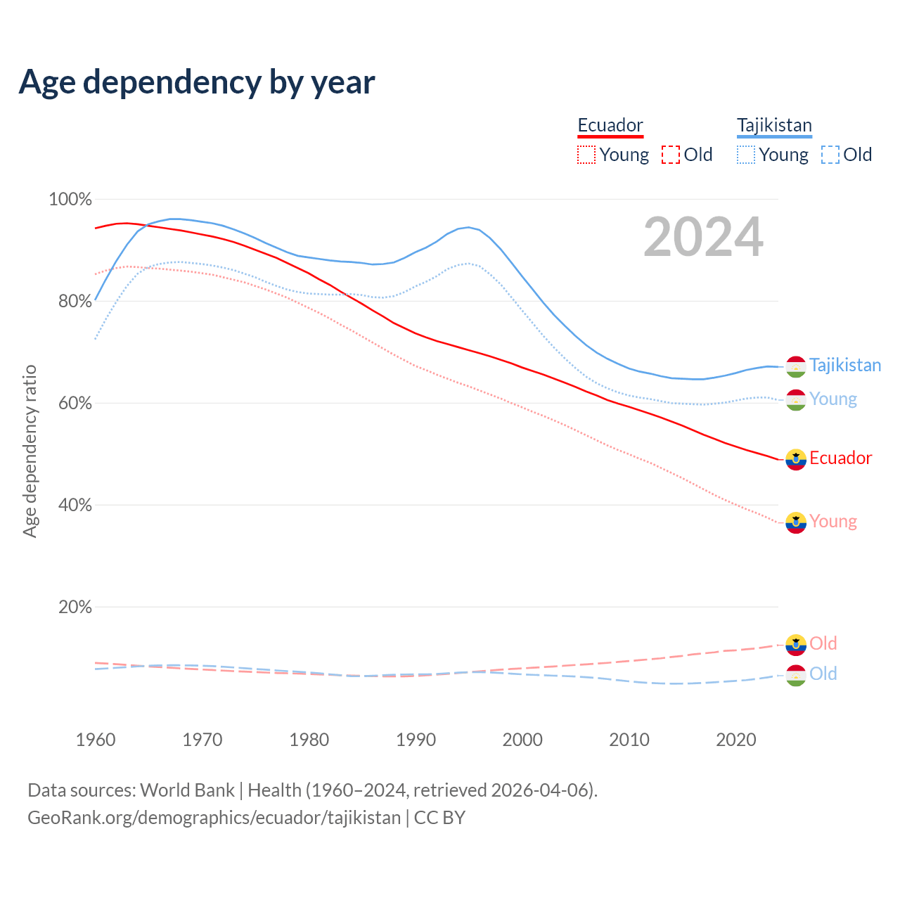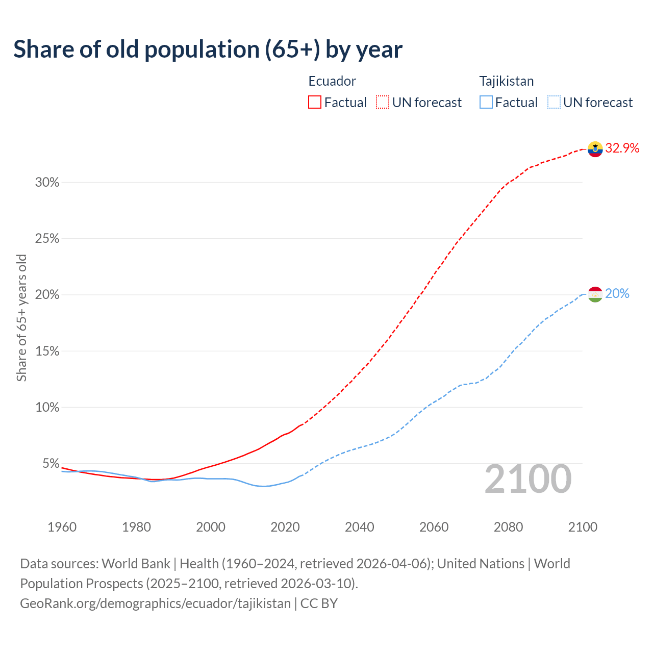 - The share of old-age demographic (65+) in Ecuador is 8.34% vs 3.85% in Tajikistan.