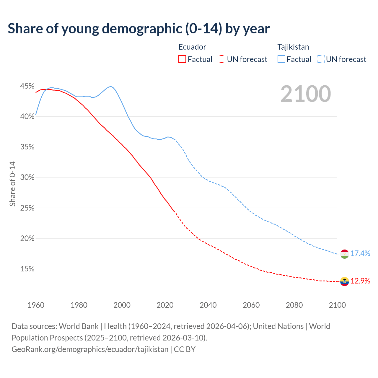 - The share of young demographic (0-15 years old) in Ecuador is 24.5% vs 36.3% in Tajikistan.