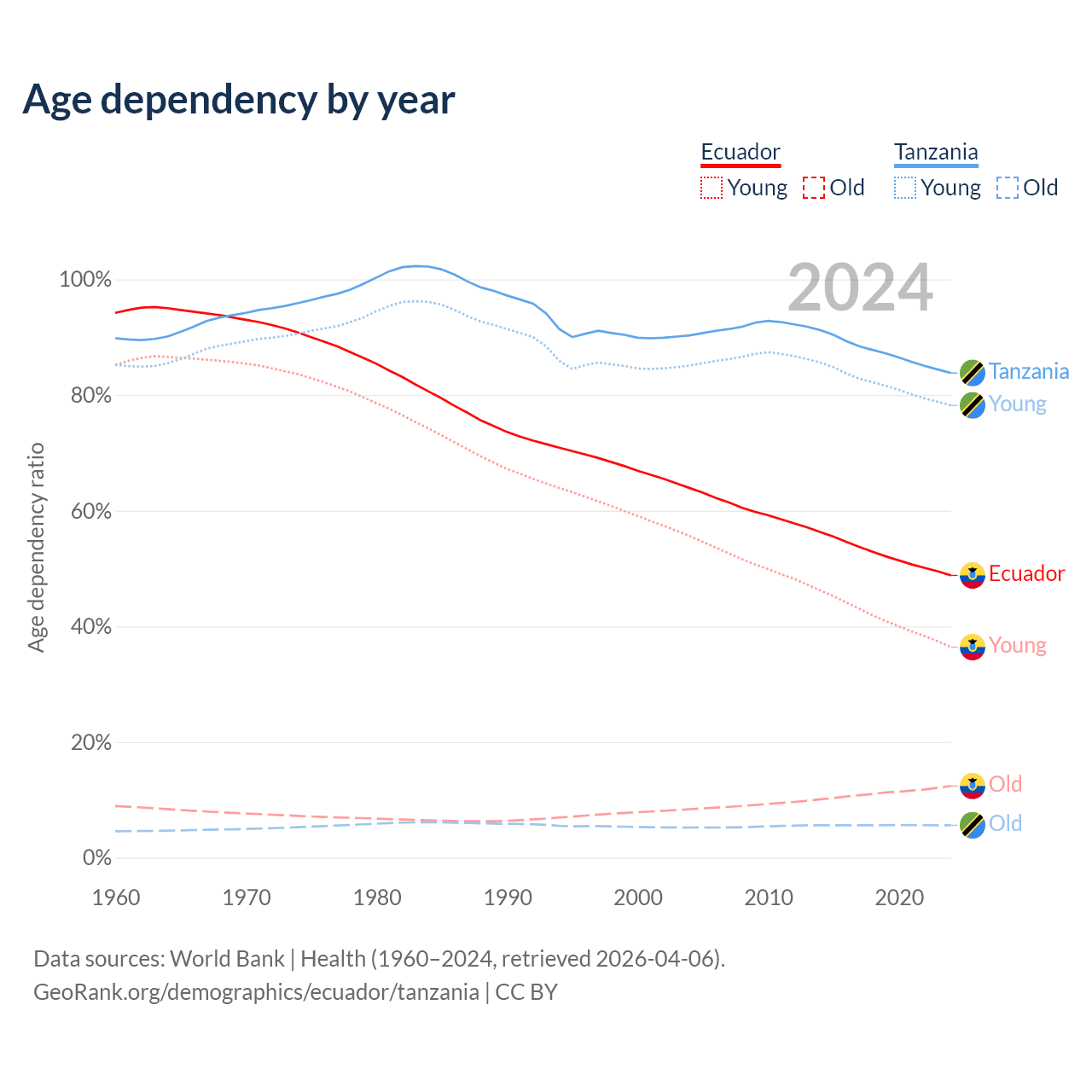- Ecuador is ranked 105/196 by median age (oldest to youngest) vs 184/196 for Tanzania.
