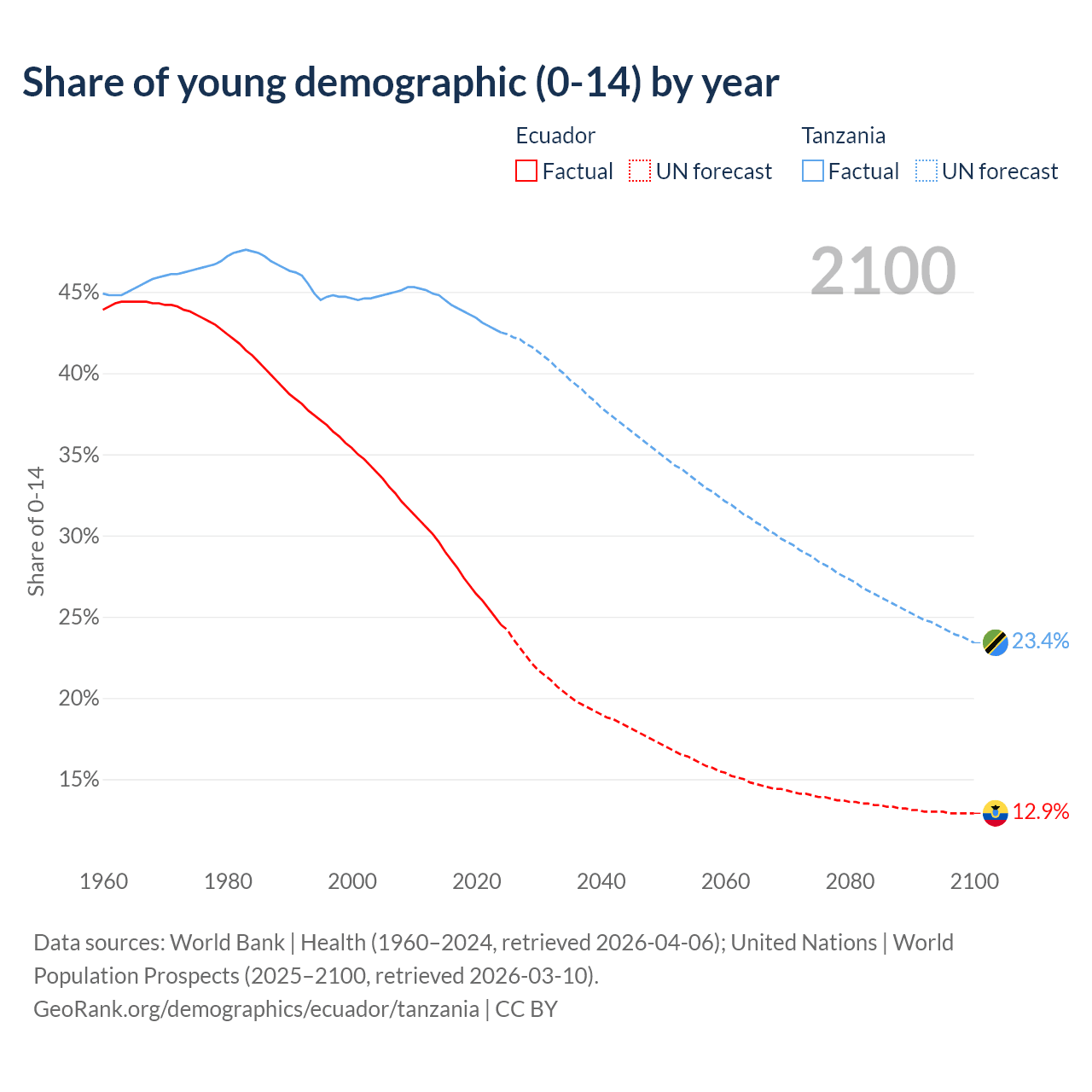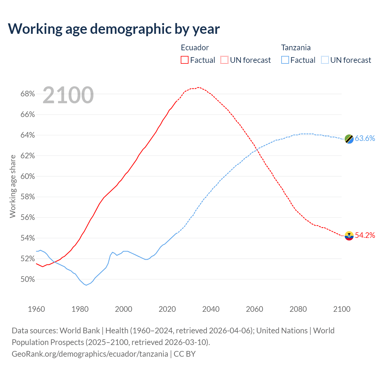 Median age Ecuador vs Tanzania, 1960-2100