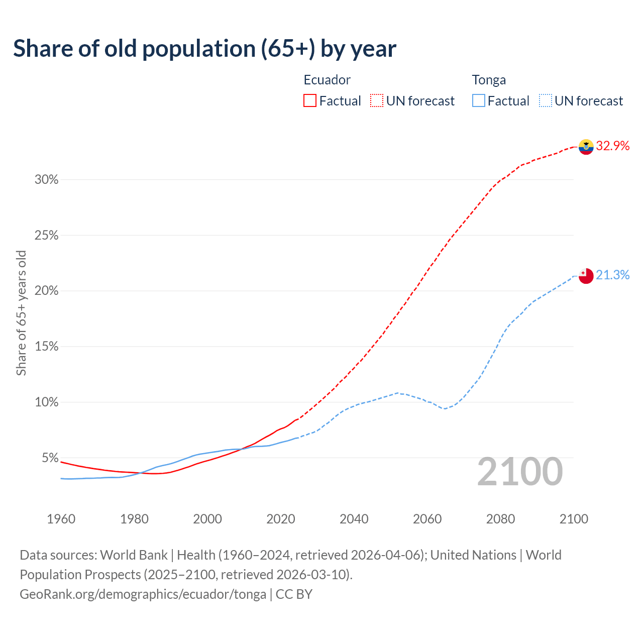 The share of older people aged 65 and over is 8.34% in Ecuador and 6.72% in Tonga. Life expectancy in Ecuador compared to Tonga .