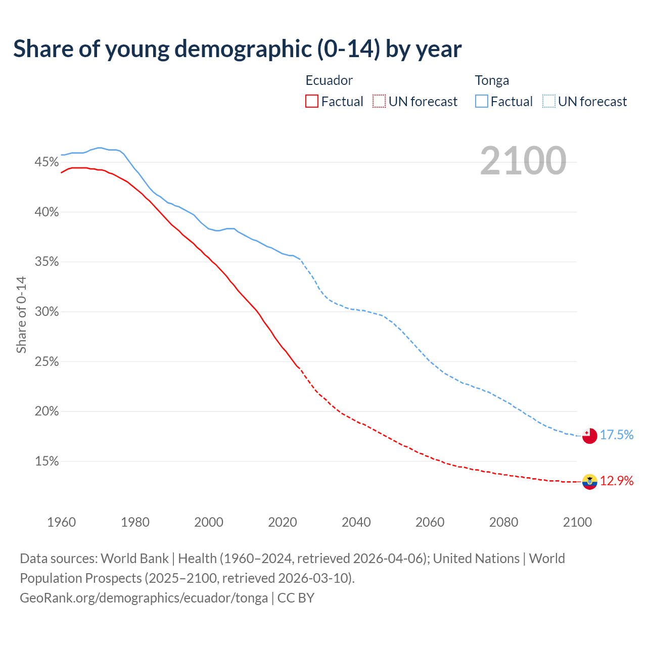 - The share of young demographic (0-15 years old) in Ecuador is 24.5% vs 35.4% in Tonga.