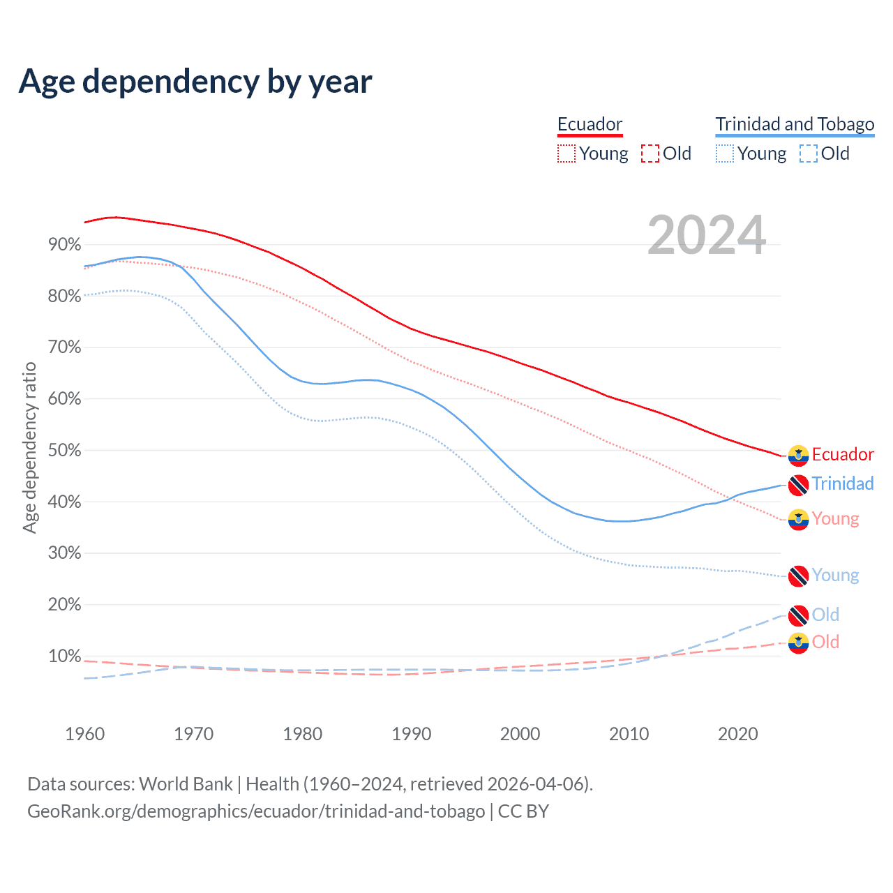 - The share of old-age demographic (65+) in Ecuador is 8.34% vs 12.4% in Trinidad and Tobago.