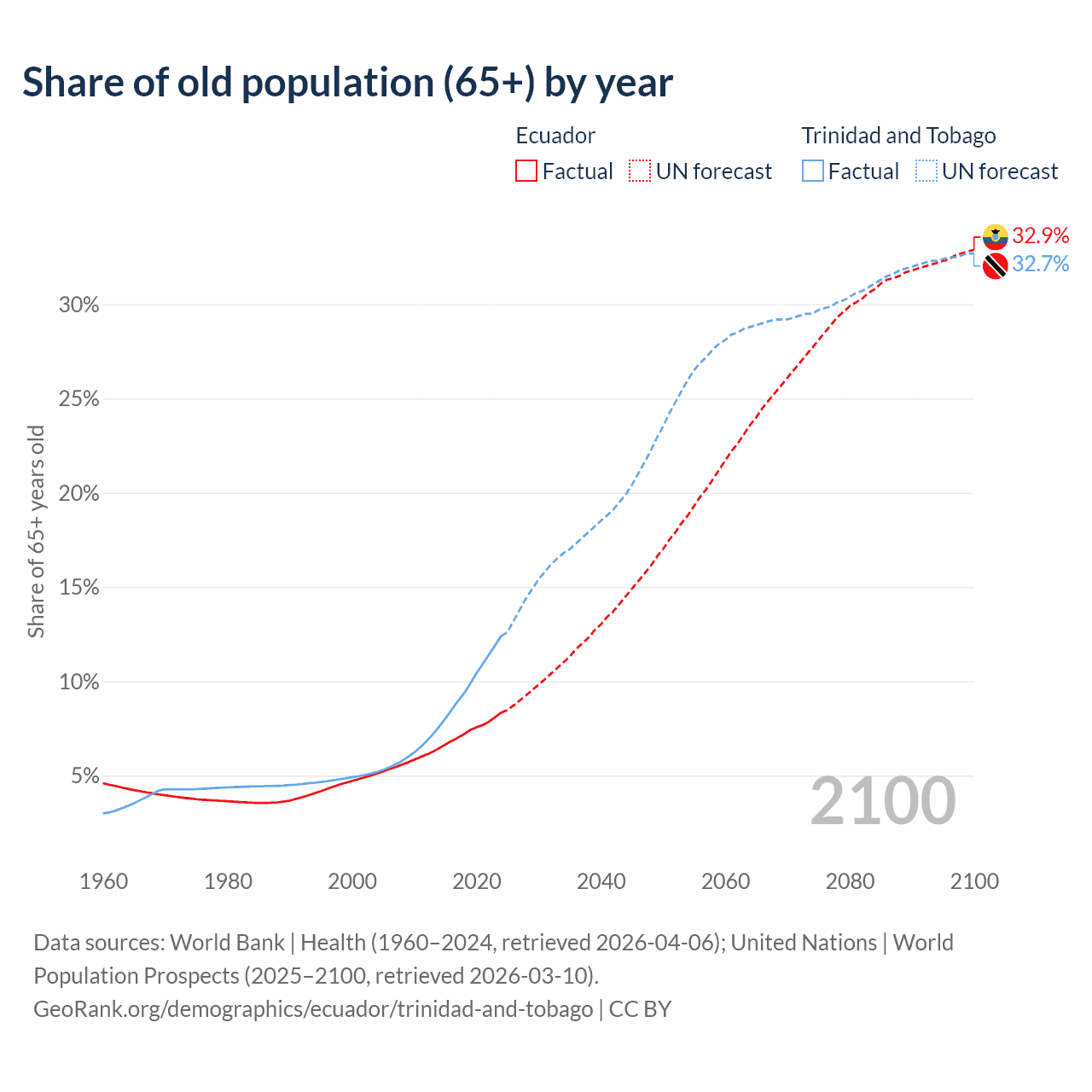 The share of older people aged 65 and over is 8.34% in Ecuador and 12.4% in Trinidad and Tobago. Life expectancy in Ecuador compared to Trinidad and Tobago .