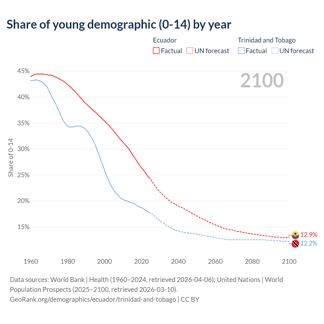 - The share of young demographic (0-15 years old) in Ecuador is 24.5% vs 17.8% in Trinidad and Tobago.