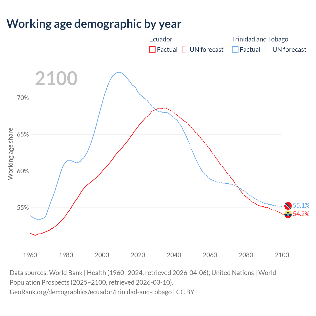 Median age Ecuador vs Trinidad and Tobago, 1960-2100