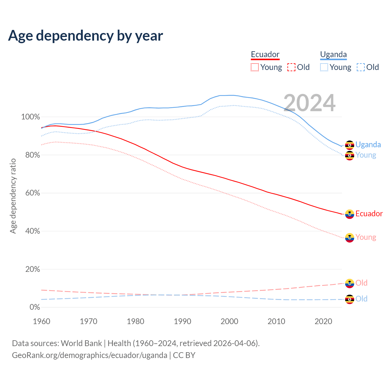 - The share of old-age demographic (65+) in Ecuador is 8.34% vs 2.19% in Uganda.