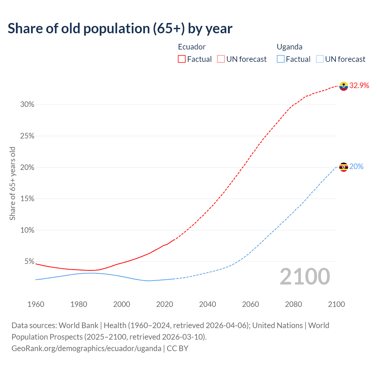 The share of older people aged 65 and over is 8.34% in Ecuador and 2.19% in Uganda. Life expectancy in Ecuador compared to Uganda .