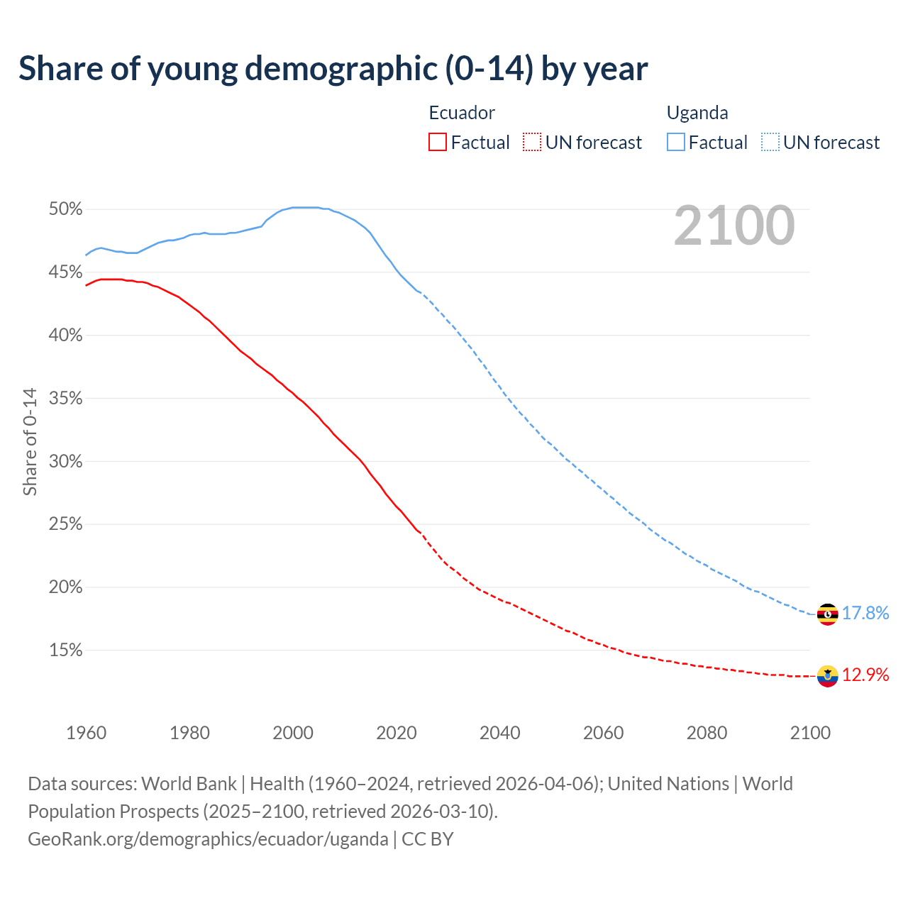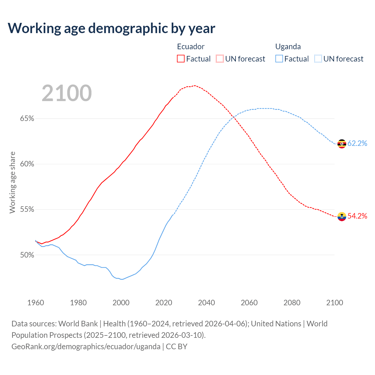 Median age Ecuador vs Uganda, 1960-2100