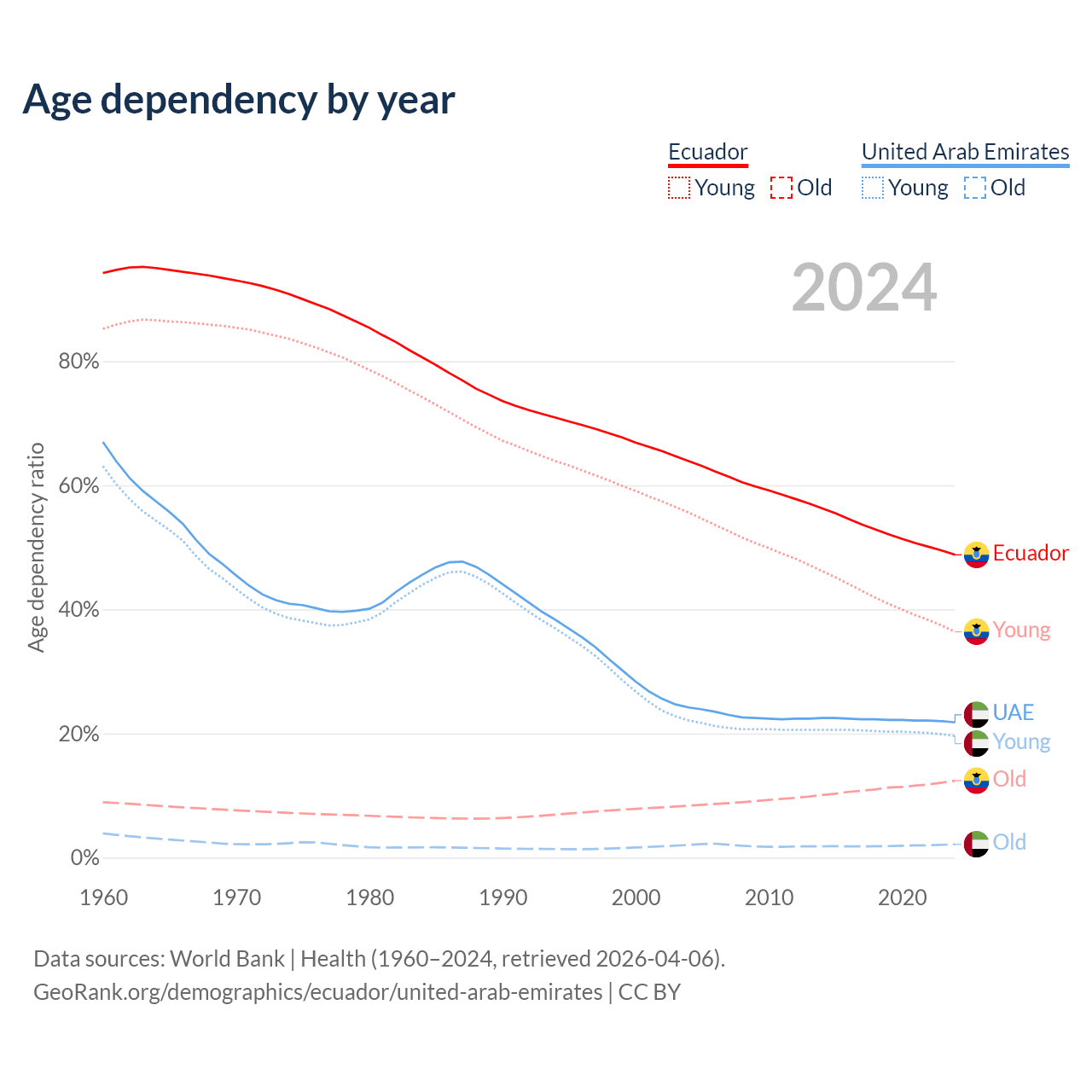 - The share of old-age demographic (65+) in Ecuador is 8.34% vs 1.77% in the United Arab Emirates.