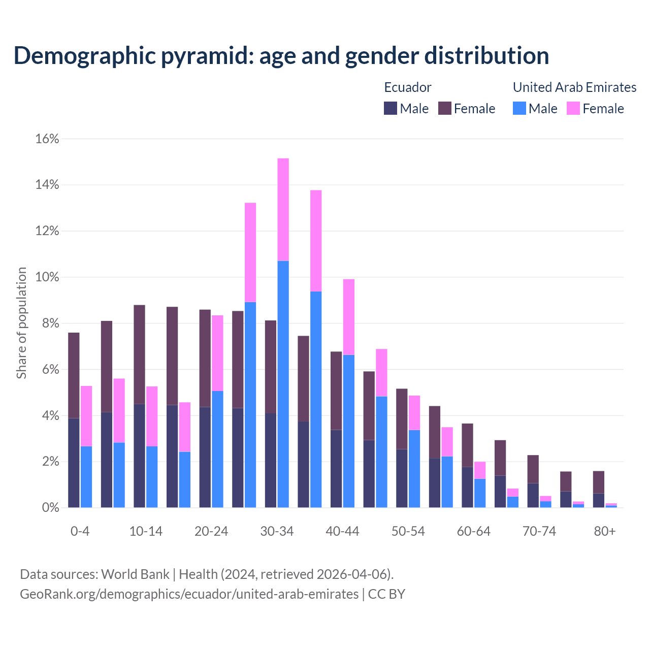 The share of older people aged 65 and over is 8.34% in Ecuador and 1.77% in the United Arab Emirates. Life expectancy in Ecuador compared to the United Arab Emirates .
