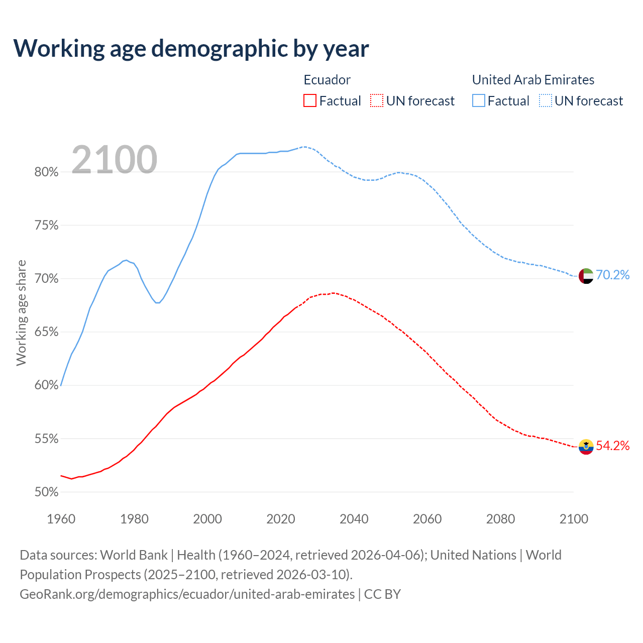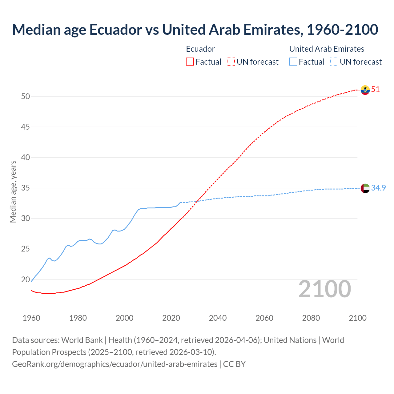 Median age Ecuador vs United Arab Emirates, 1960-2100