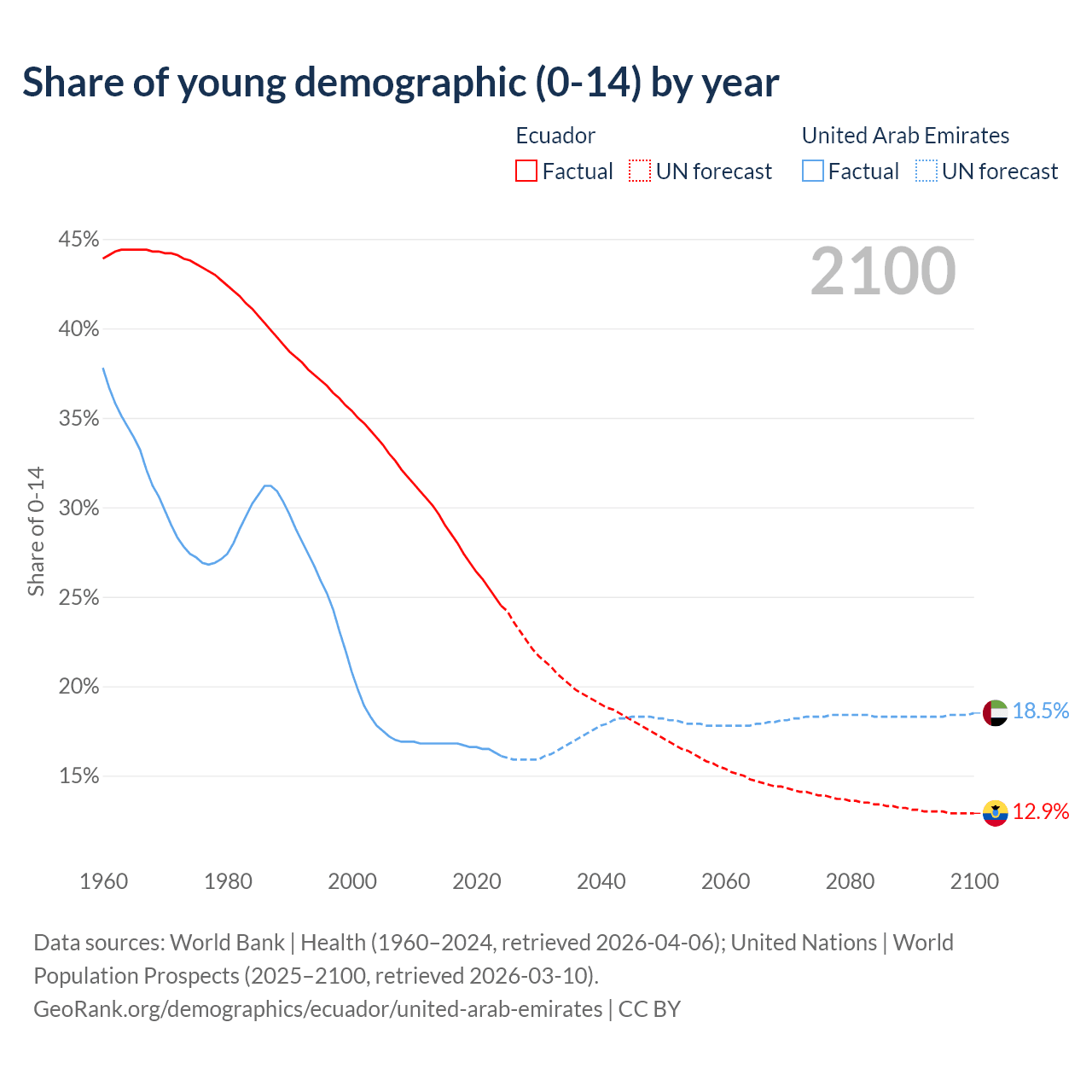 - The share of young demographic (0-15 years old) in Ecuador is 24.5% vs 16.1% in the United Arab Emirates.