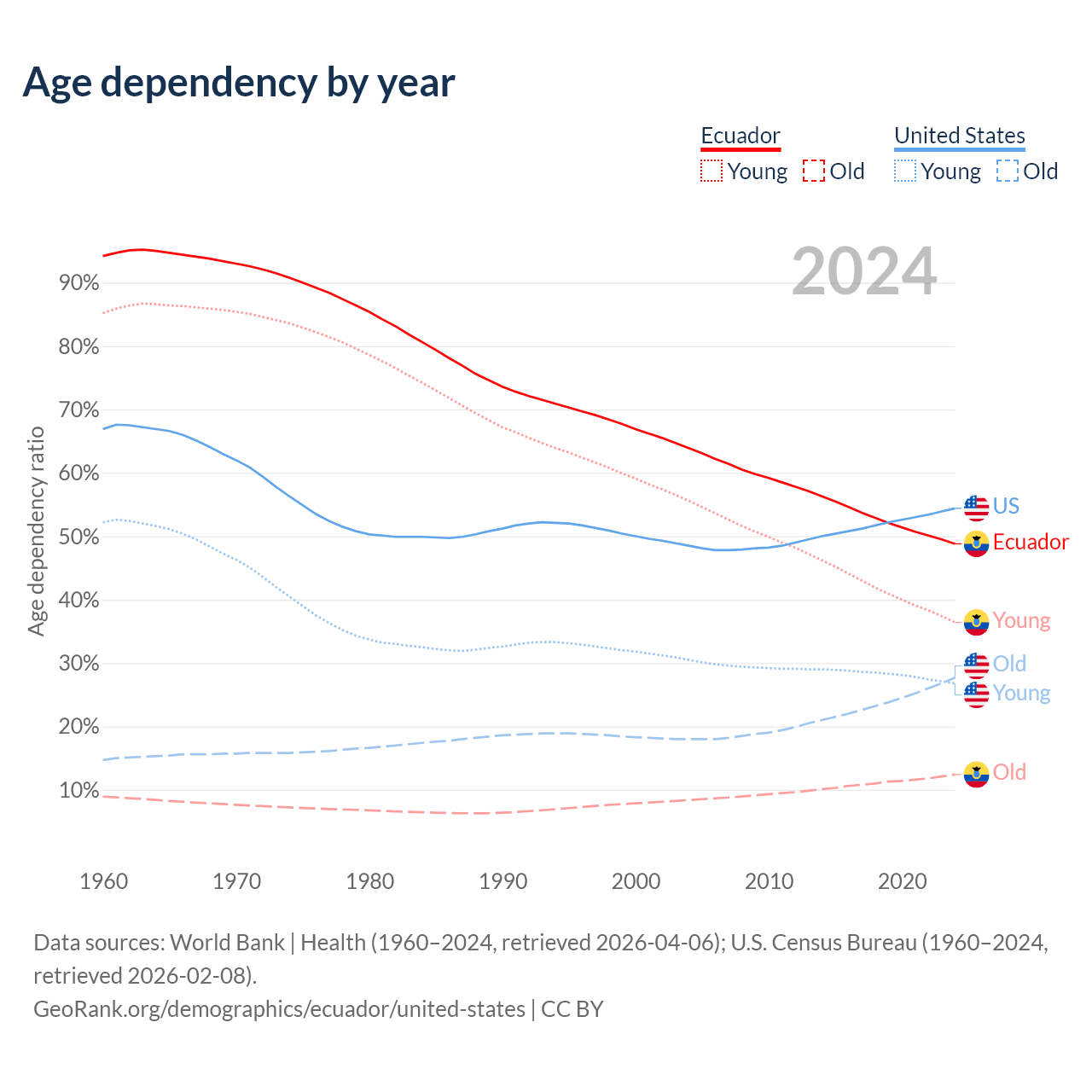 - The share of old-age demographic (65+) in Ecuador is 8.34% vs 17.9% in the United States.