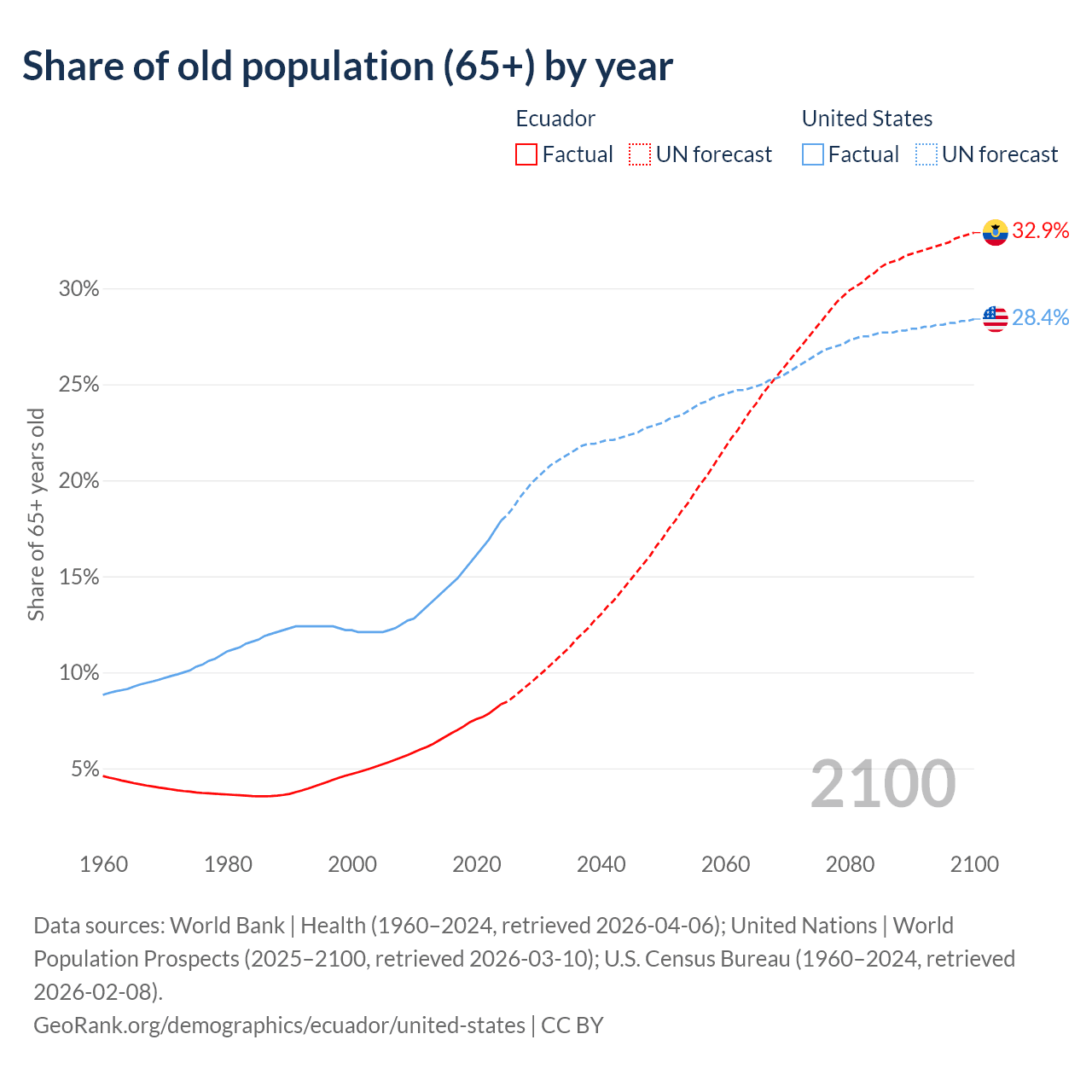 The share of older people aged 65 and over is 8.34% in Ecuador and 17.9% in the United States. Life expectancy in Ecuador compared to the United States .