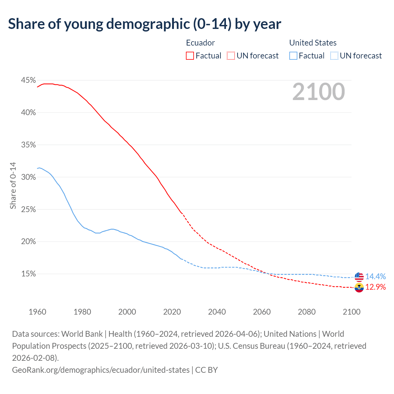 - The share of young demographic (0-15 years old) in Ecuador is 24.5% vs 17.3% in the United States.