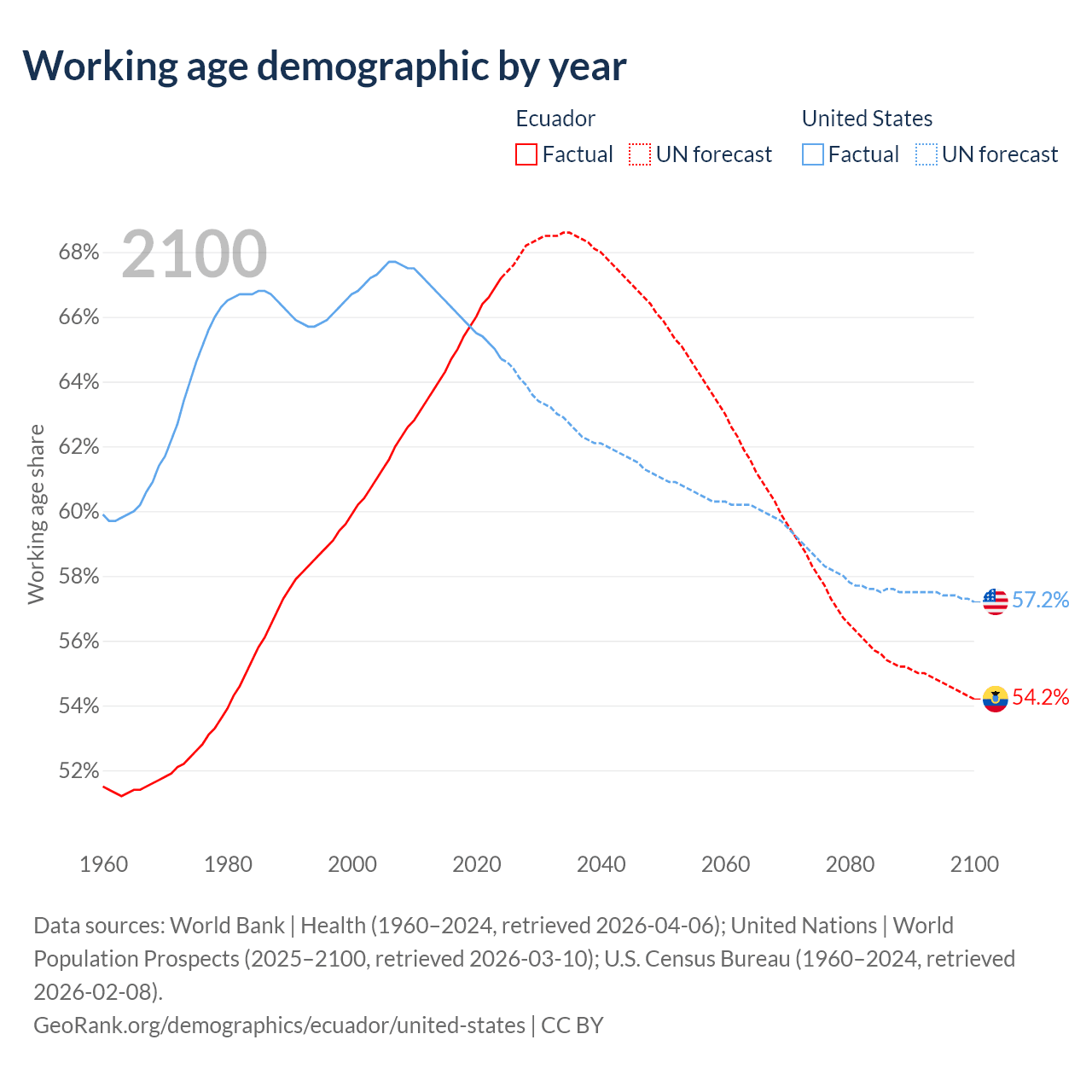 Median age Ecuador vs United States, 1960-2100