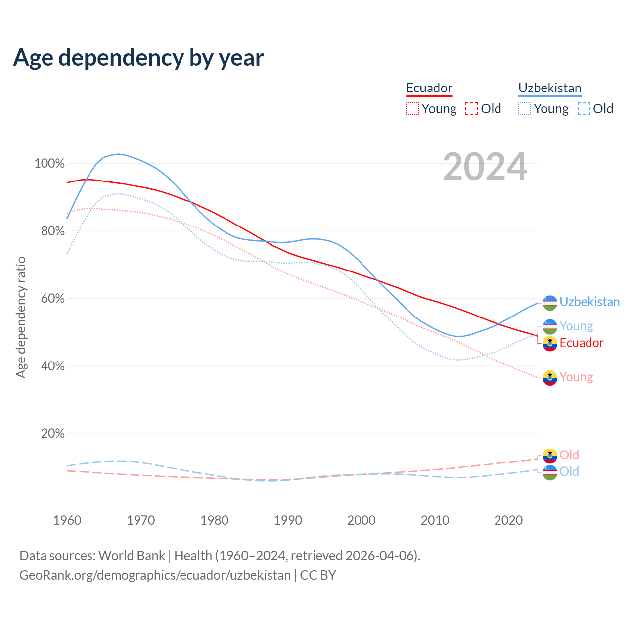 Data sources: World Bank | Health (1960–2024, retrieved 2026-04-06); U.S. Census Bureau (1960–2024, retrieved 2026-02-08).