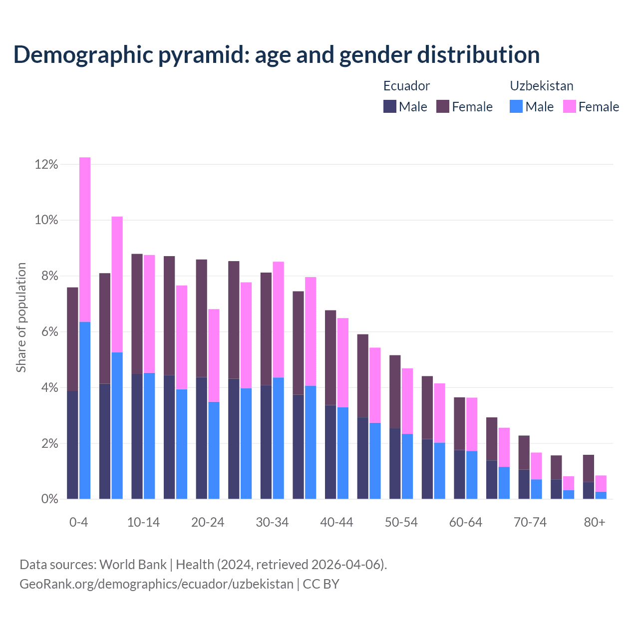 - The share of old-age demographic (65+) in Ecuador is 8.34% vs 5.86% in Uzbekistan.
