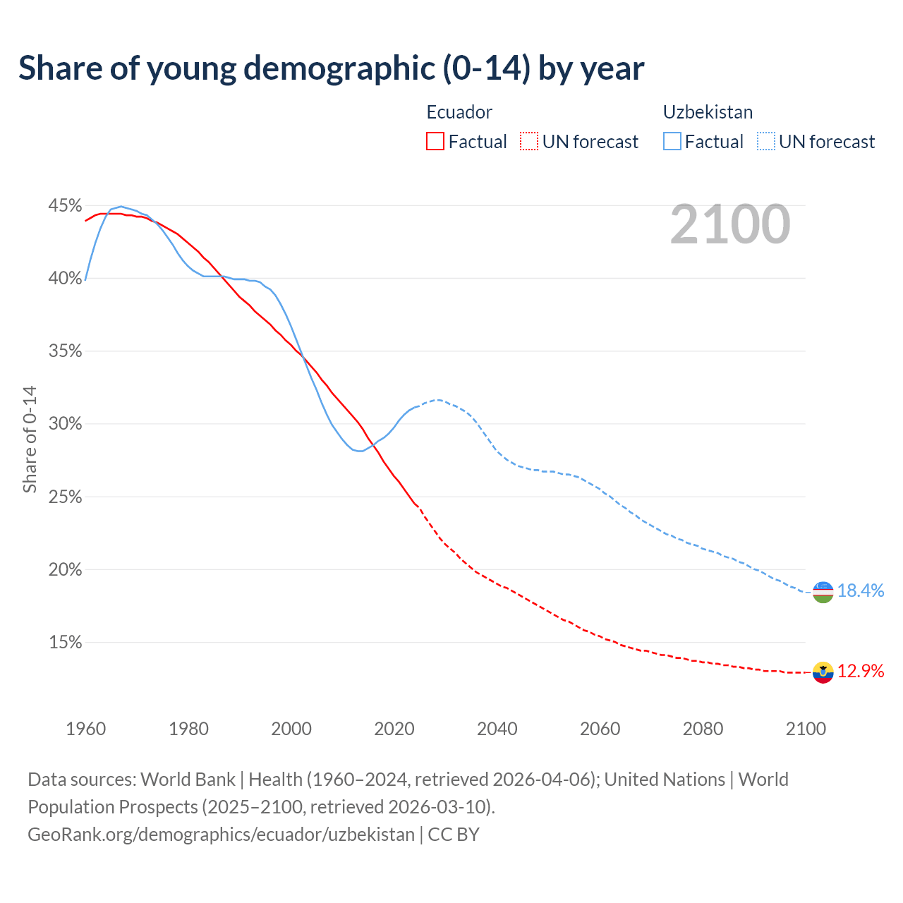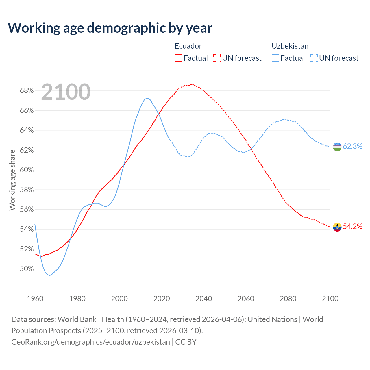 Median age Ecuador vs Uzbekistan, 1960-2100