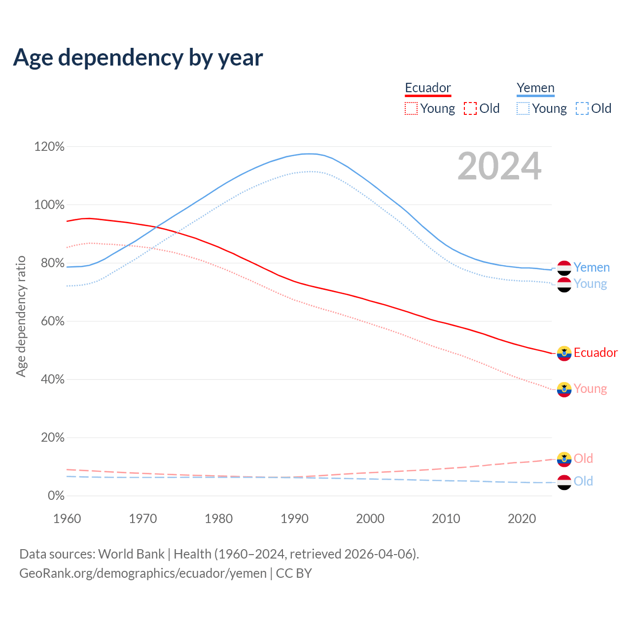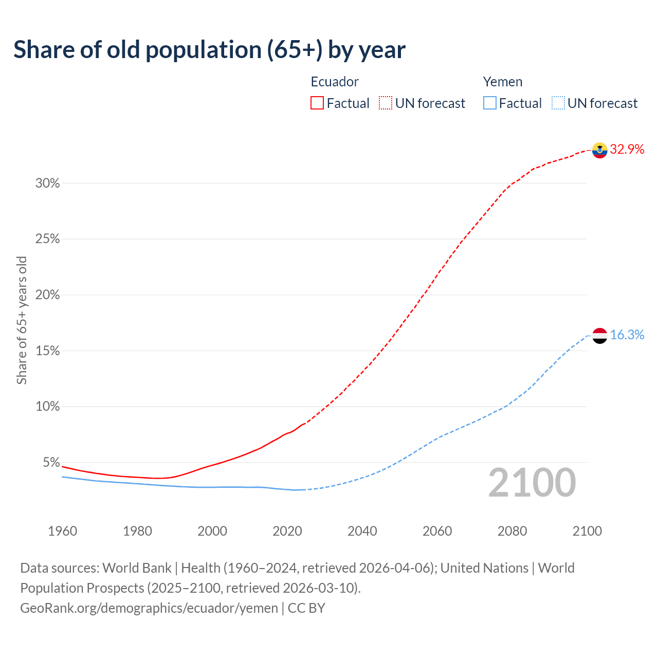 - The share of old-age demographic (65+) in Ecuador is 8.34% vs 2.52% in Yemen.