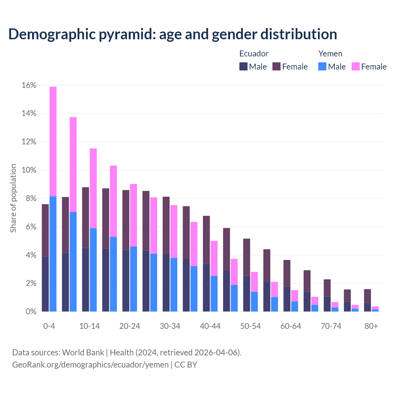 - Ecuador is ranked 105/196 by median age (oldest to youngest) vs 174/196 for Yemen.