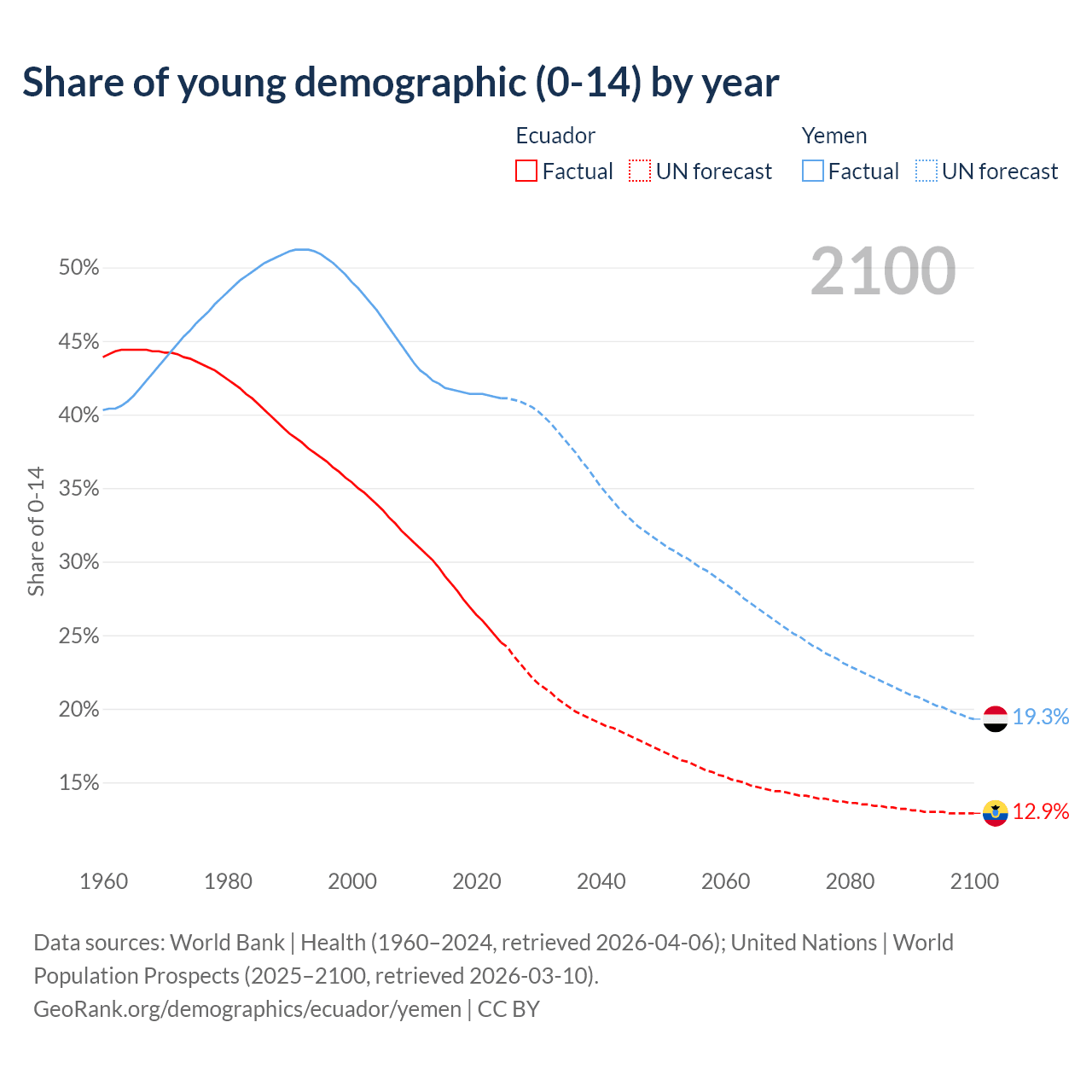 - The share of young demographic (0-15 years old) in Ecuador is 24.5% vs 41.1% in Yemen.