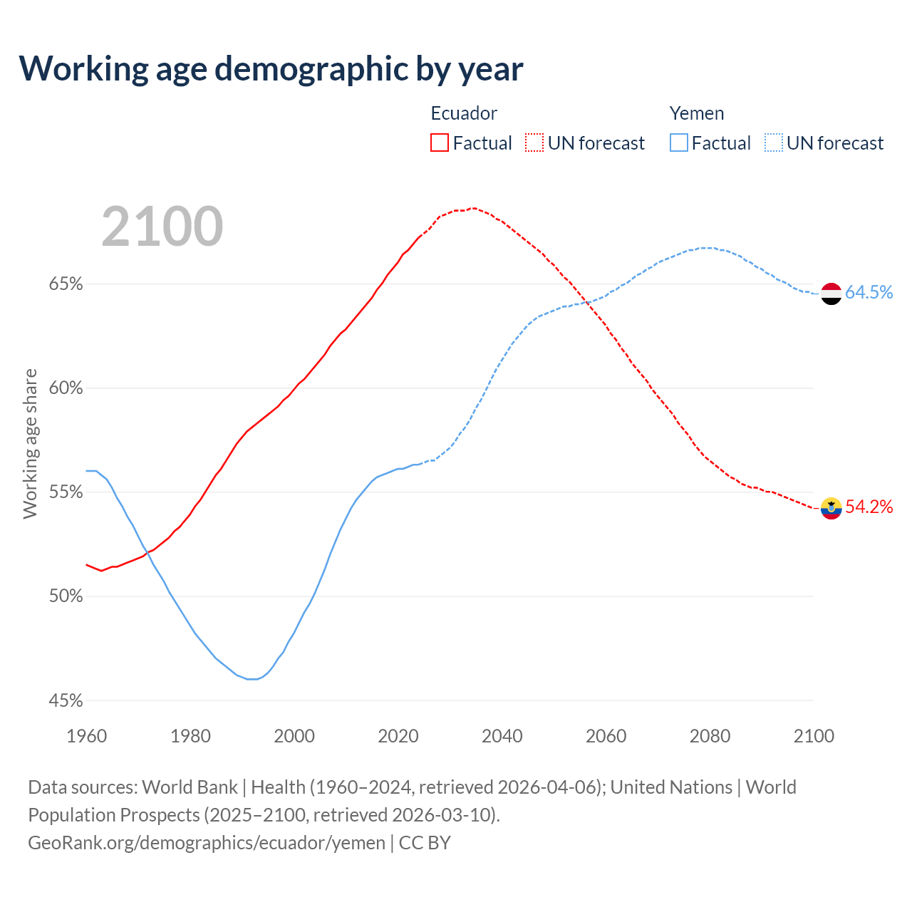 - Ecuador has 12.4M working age adults (aged 15-64) vs 24.4M in Yemen.