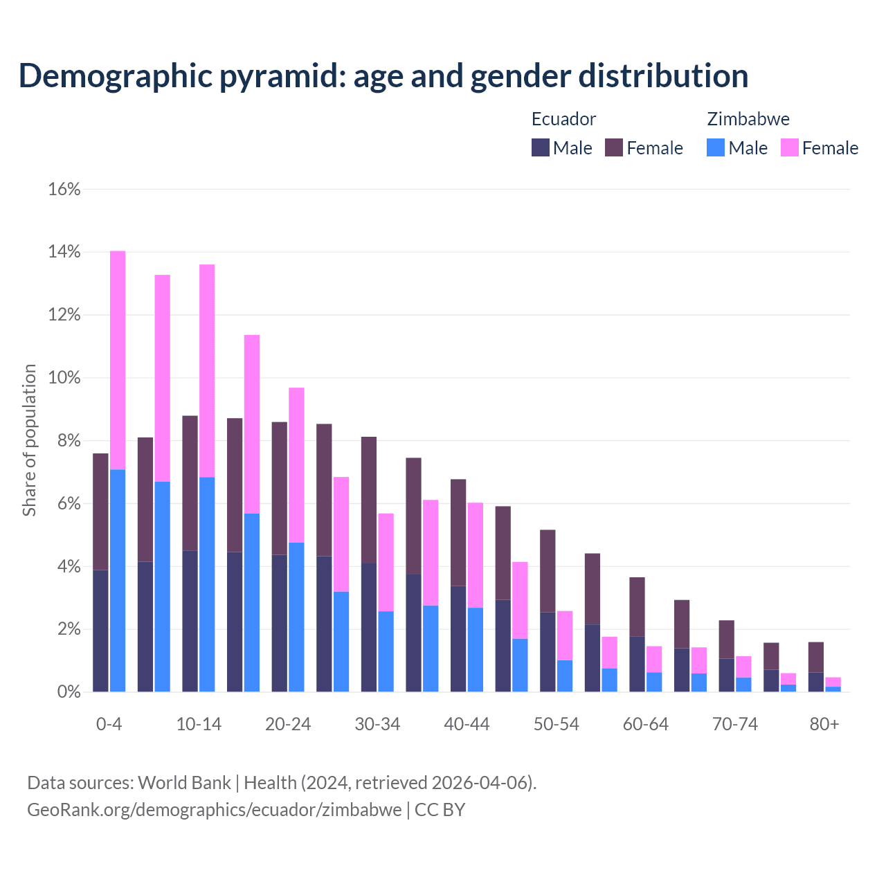 - Ecuador is ranked 105/196 by median age (oldest to youngest) vs 177/196 for Zimbabwe.