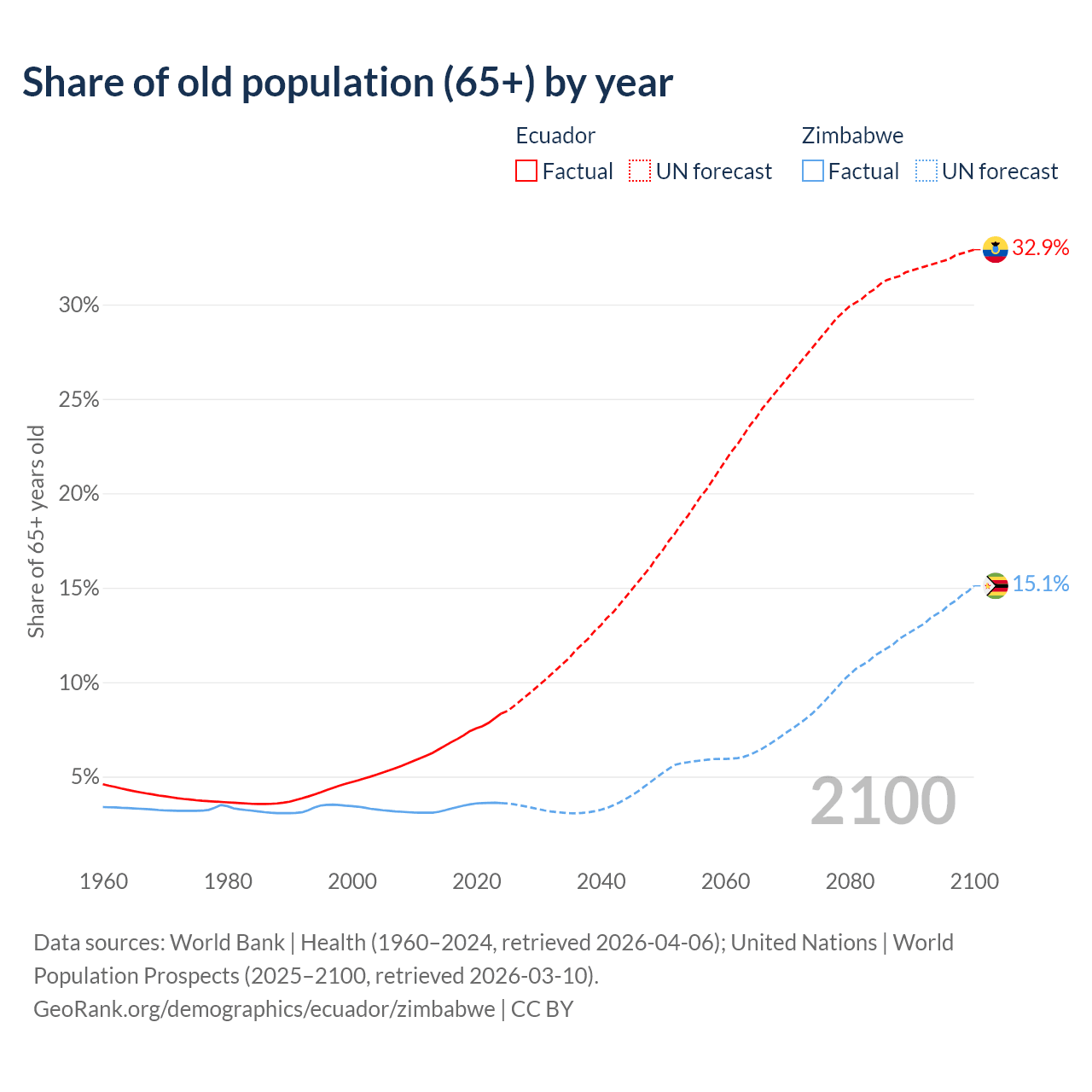 The share of older people aged 65 and over is 8.34% in Ecuador and 3.6% in Zimbabwe. Life expectancy in Ecuador compared to Zimbabwe .